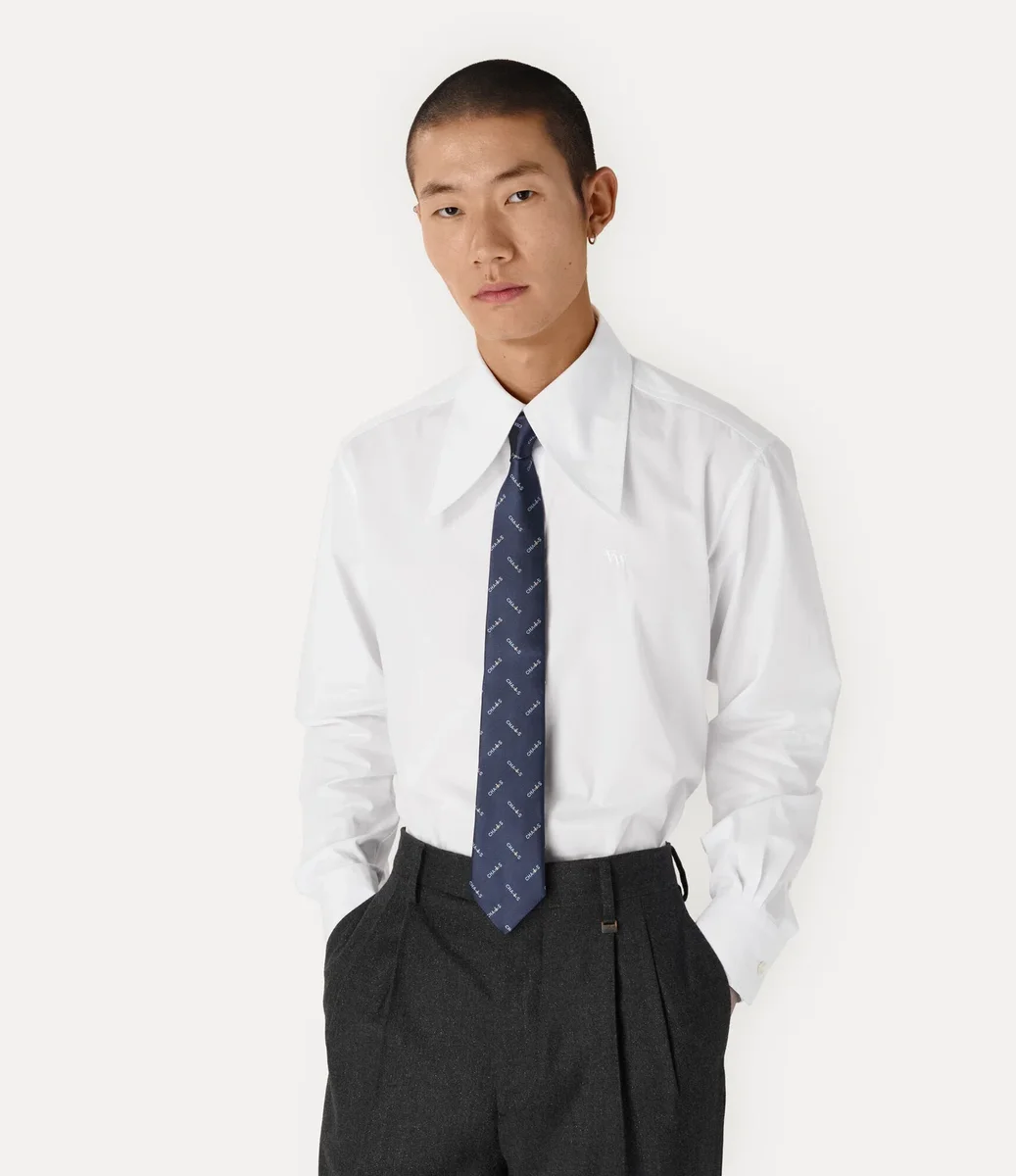 Our silk tie features a wide blade that tapers to a classic pointed tip. The design is finished with the house’s signature “CHAOS” slogan, repeated throughout, capturing Vivienne’s rebellious spirit and her commitment to challenging political conventions.