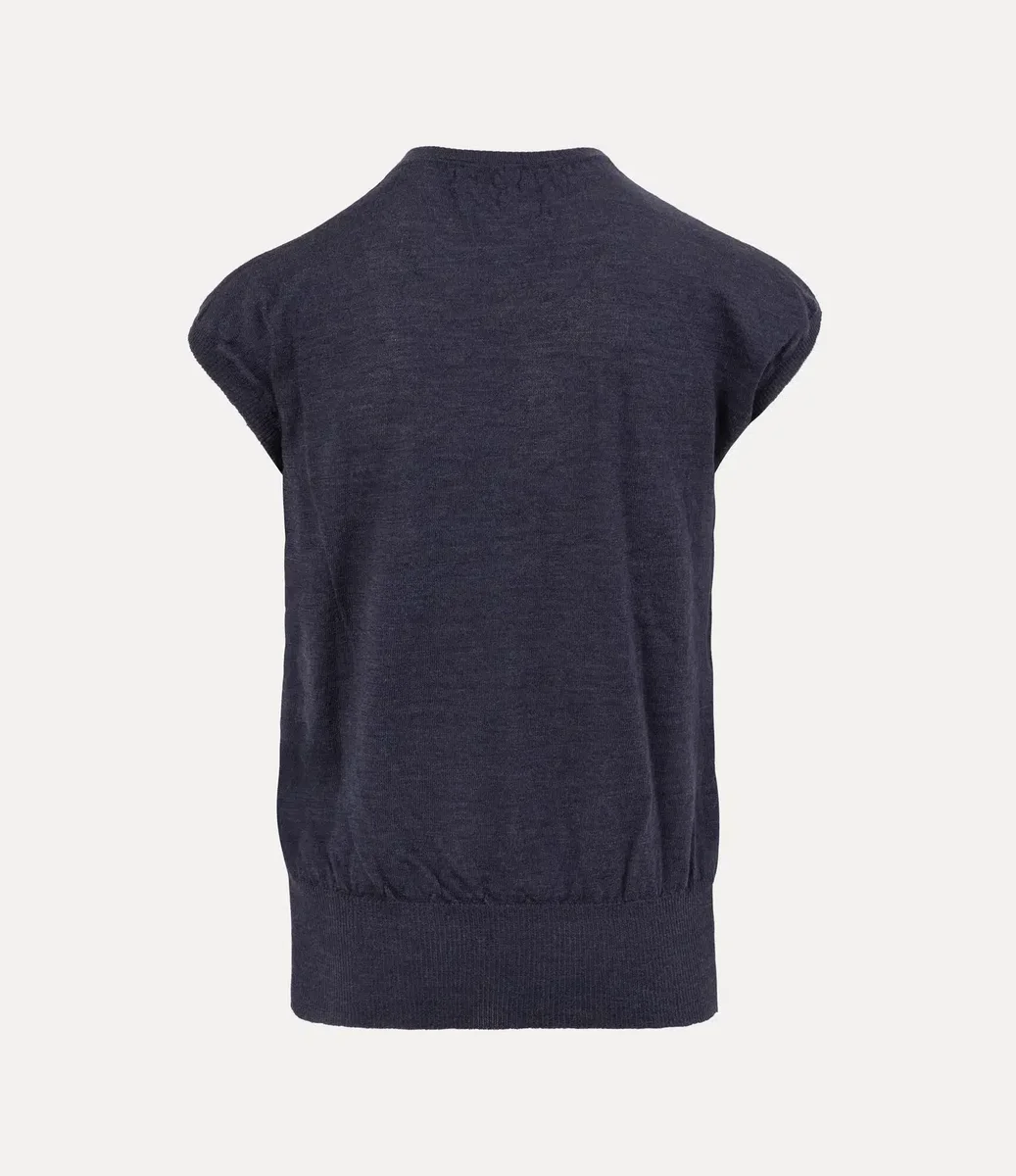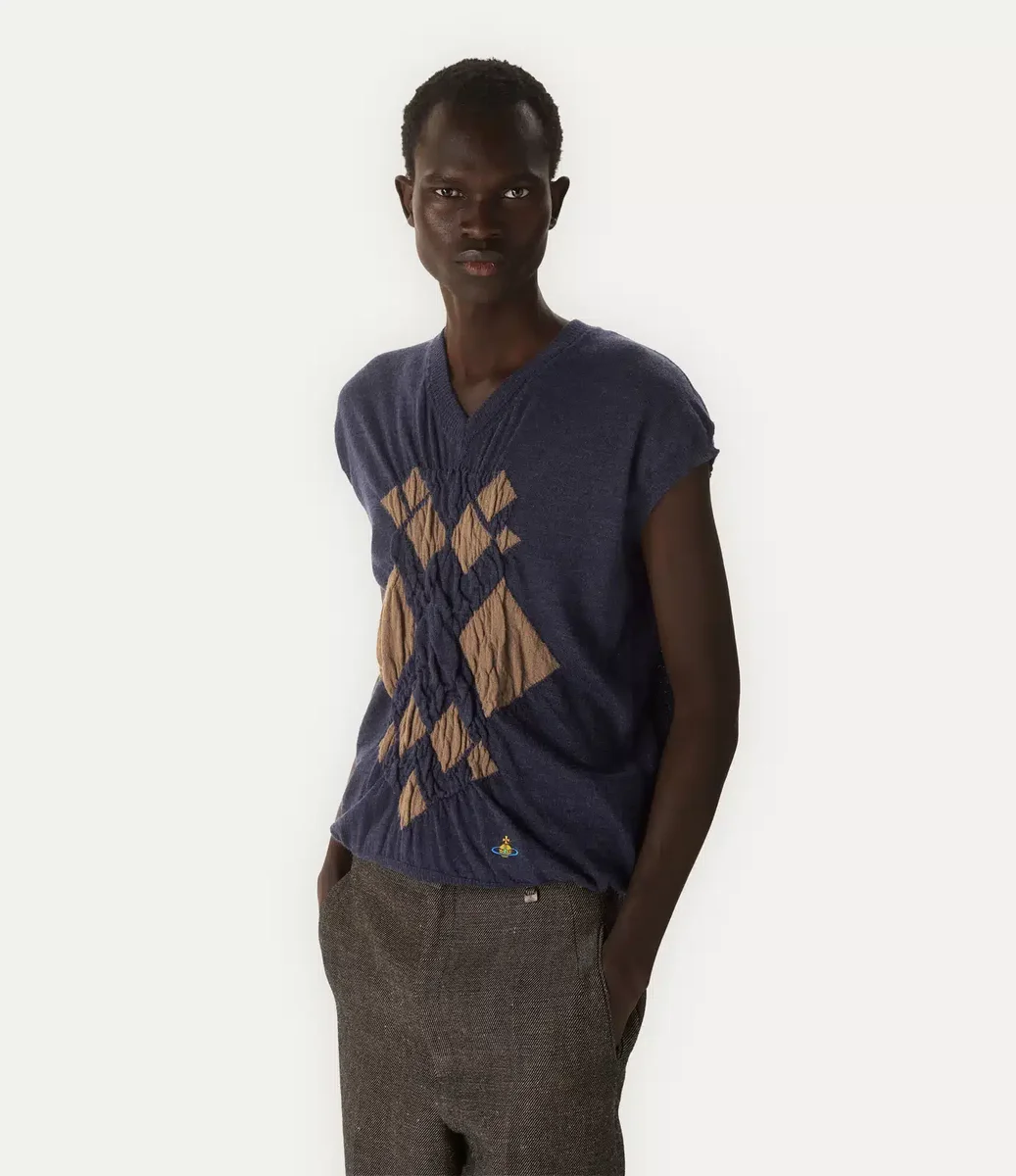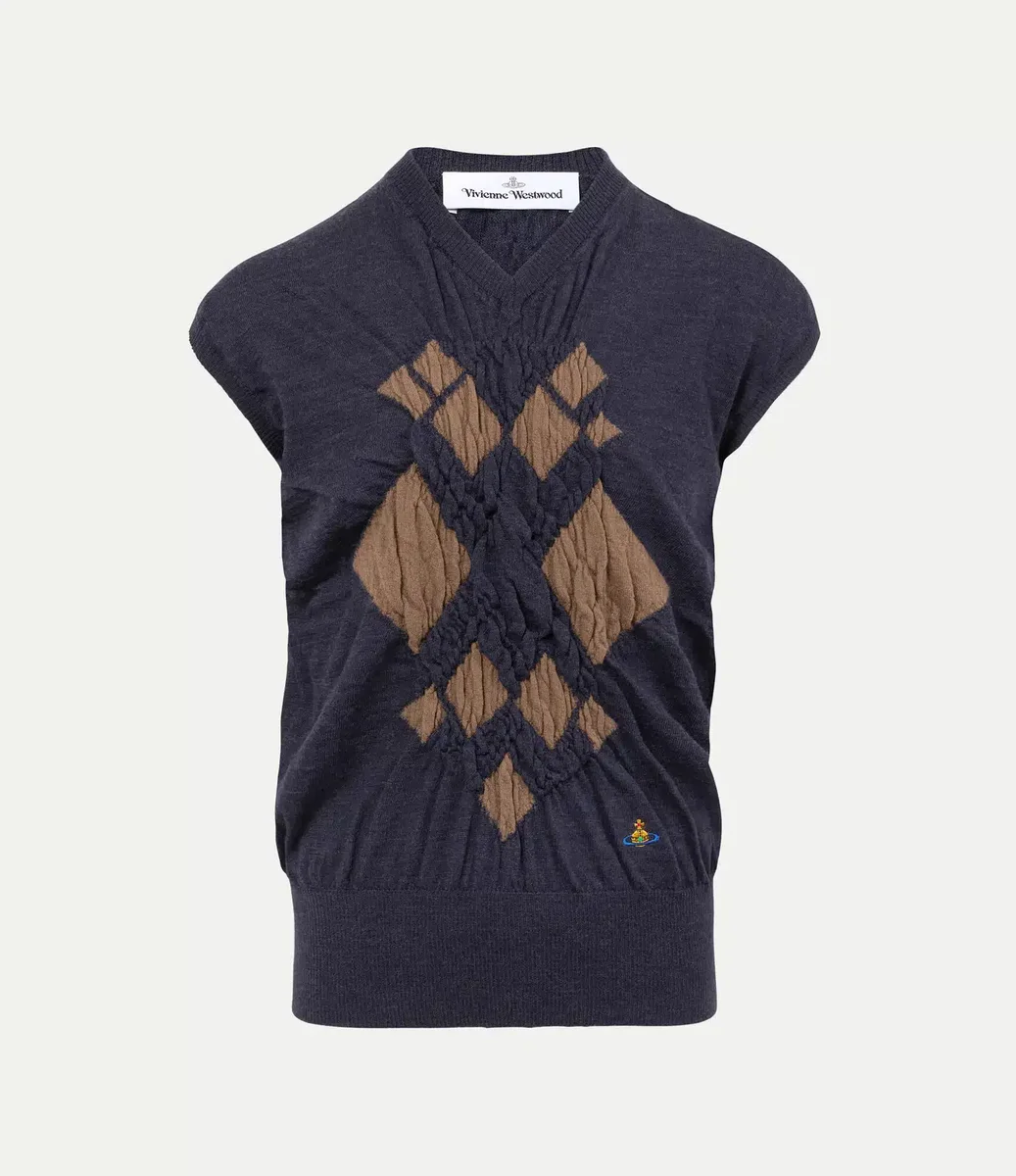 Our Greg vest is crafted from a wool-blend jacquard with contrasting diamond motifs, first seen in the Andreas Kronthaler for Vivienne Westwood Spring-Summer 2024 show. The piece offers a naturally wrinkled structure in the knit, finished with a ribbed hemline and a delicate embroidered orb detail.