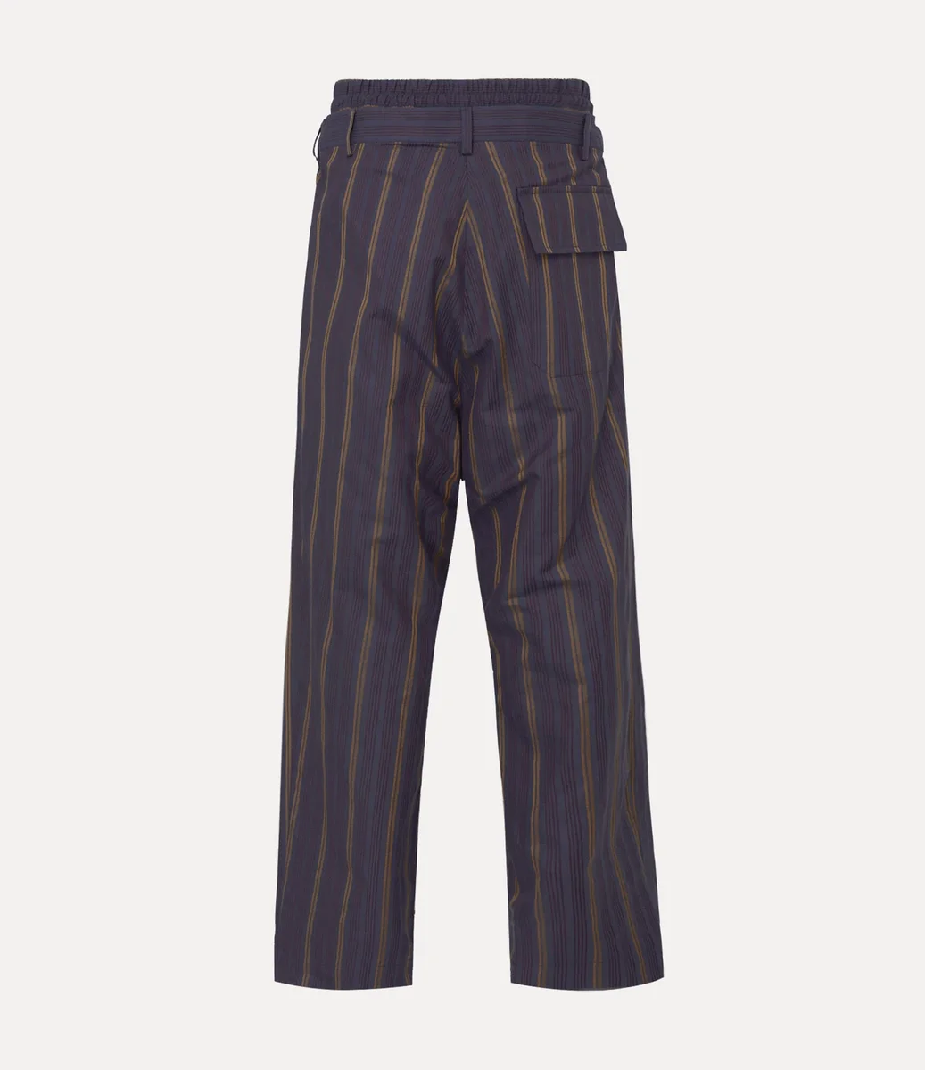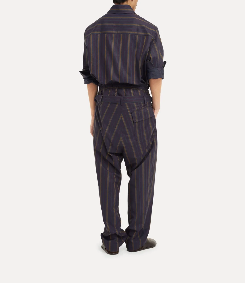 Our Builder trousers return this season in a striped cotton finish, detailed with an embroidered orb at the hip. Featuring a distinctive double waistband, the design employs Vivienne’s experimental ‘Builder’ tailoring system – first introduced in the Autumn–Winter 2014–15 collection, ‘Save the Rainforest’.