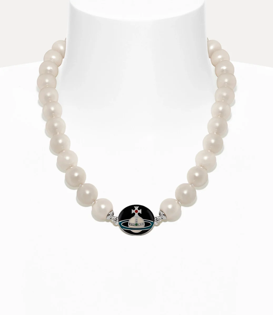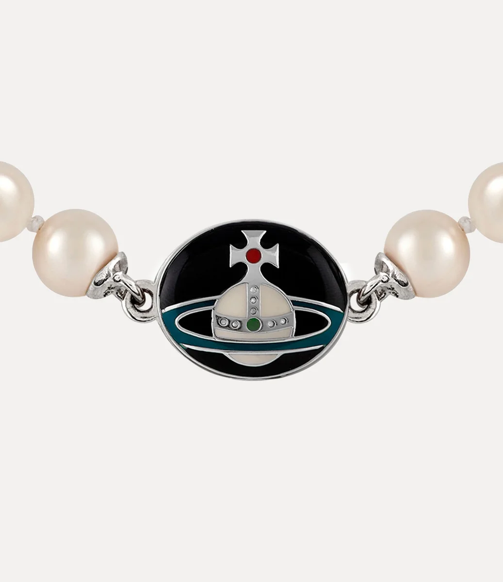The house’s signature orb motif represents Vivienne’s vision of launching tradition into the future. Our Man. Loelia Large Pearl necklace offers a refreshed version of the orb, placed in the centre of the oval, button-inspired closure, complete with hand-painted enamel details.