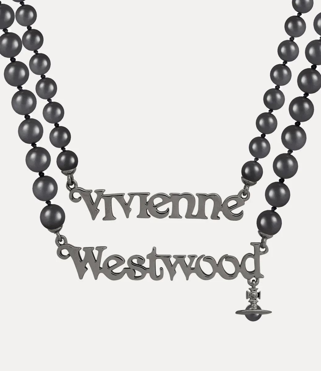 Our gunmetal-tone Man. Emilio necklace features two rows of glistening Swarovski pearls, evoking a sense of grandeur and luxury. At the centre, the design features the signature ‘Vivienne Westwood’ lettering motif, from which a dangling pearl orb charm is suspended.