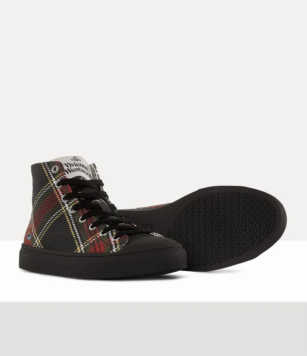Vivienne Westwood High-top plimsoll in this season’s muted-tone Chelsea tartan, features our embroidered orb at the ankle and classic canvas silhouette.