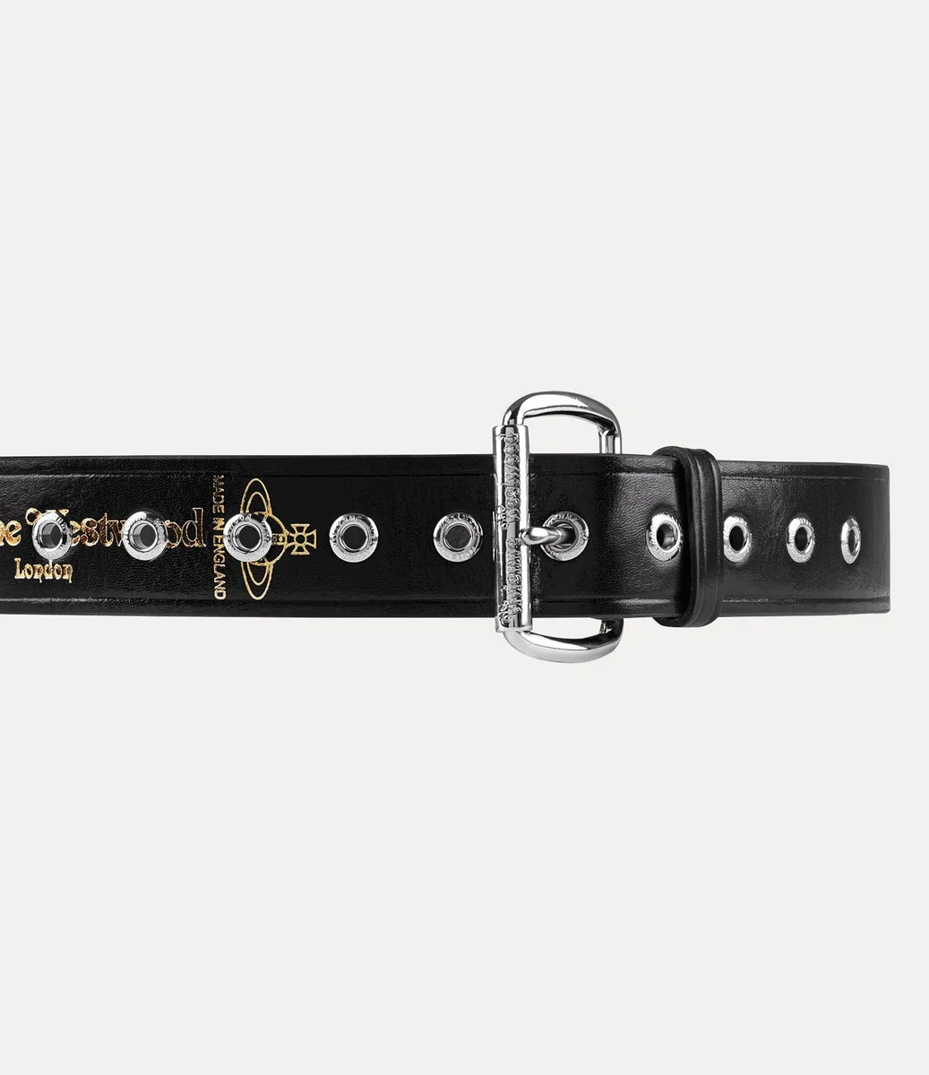 Our Alex belt has been reimagined this season in black leather, complete with updated silver-tone hardware. The piece pays homage to the original design and features engraved Vivienne Westwood lettering on the buckle, enhanced by foil-embossed branding on the strap.
