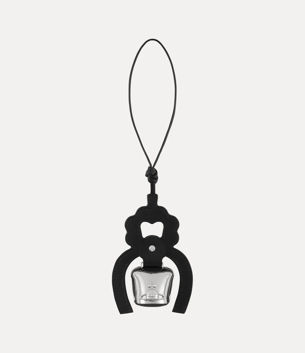 Vivienne Westwood Bell charm has a central bell in a horseshoe-shaped leather frame, loops securely over itself, and features a three-dimensional orb finish.