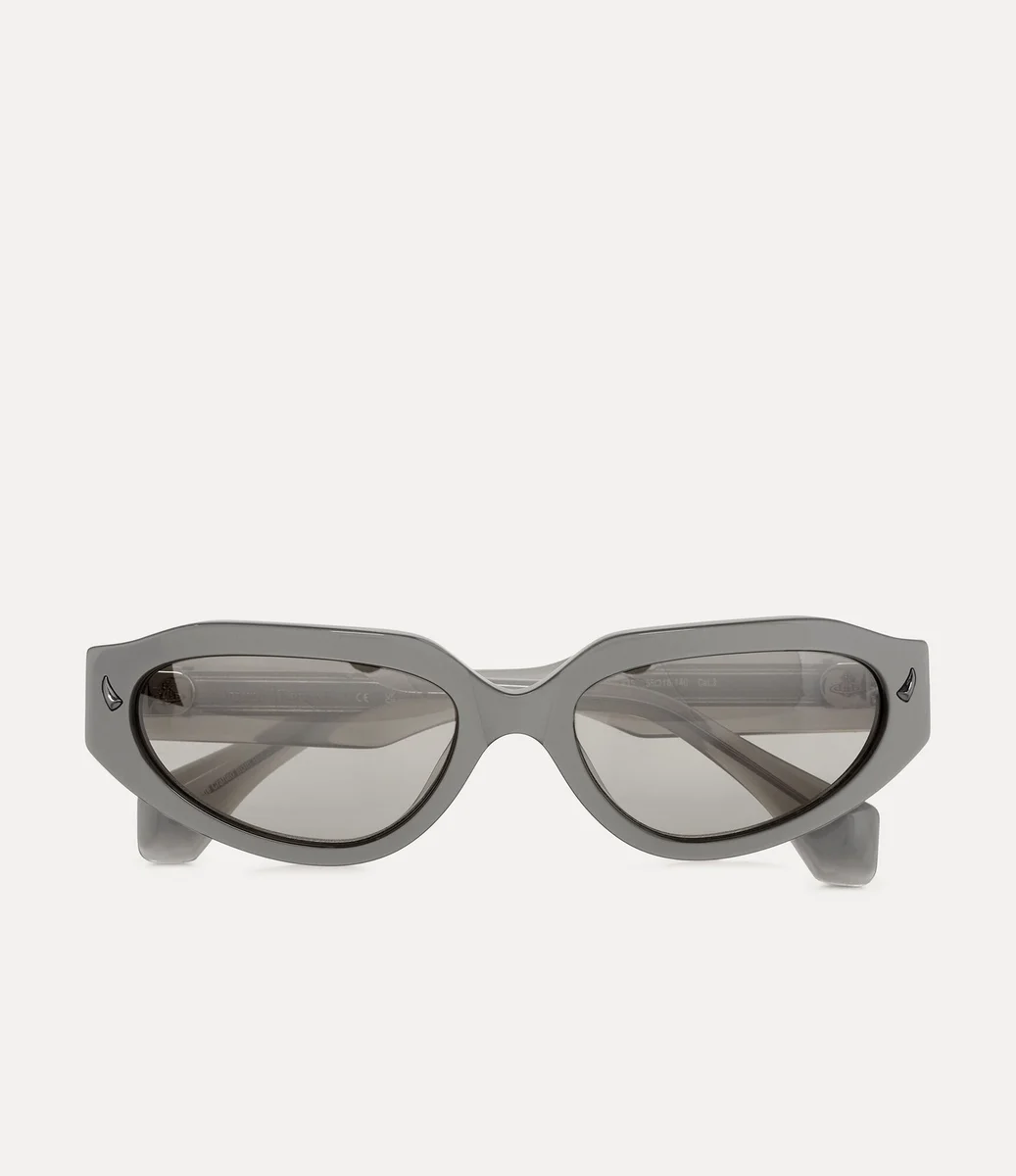 The Grace sunglasses offer a vintage-inspired oval silhouette, characterised by a bold, softly flared outer edge, drawing inspiration from the glamour and timeless icons from Studio 54. Offered in a shiny silver finish, the design is elevated by tinted tonal lenses and horn-shaped embellishments adorning the outer rim – paying homage to Vivienne’s iconic Horn Alice band.
