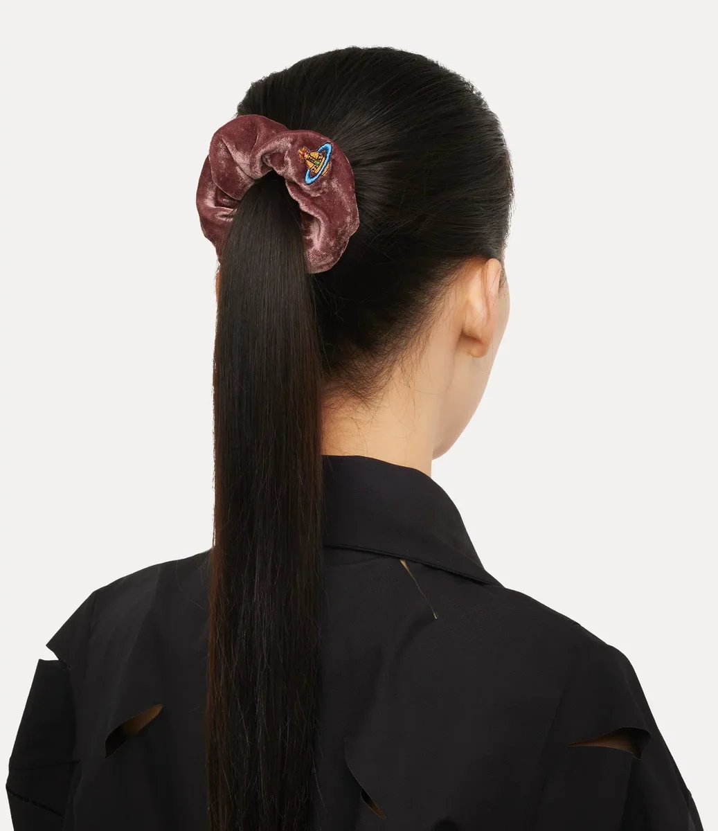 Our small scrunchie is made from a soft silk-blend, featuring a velvety textured finish. It is accented with the classic orb embroidery in multi-colored thread, embodying the house’s ethos of linking the past with the future.