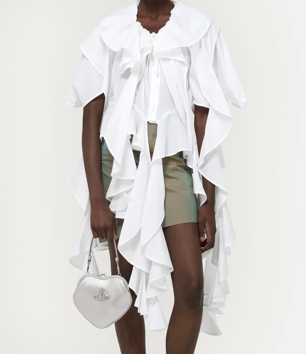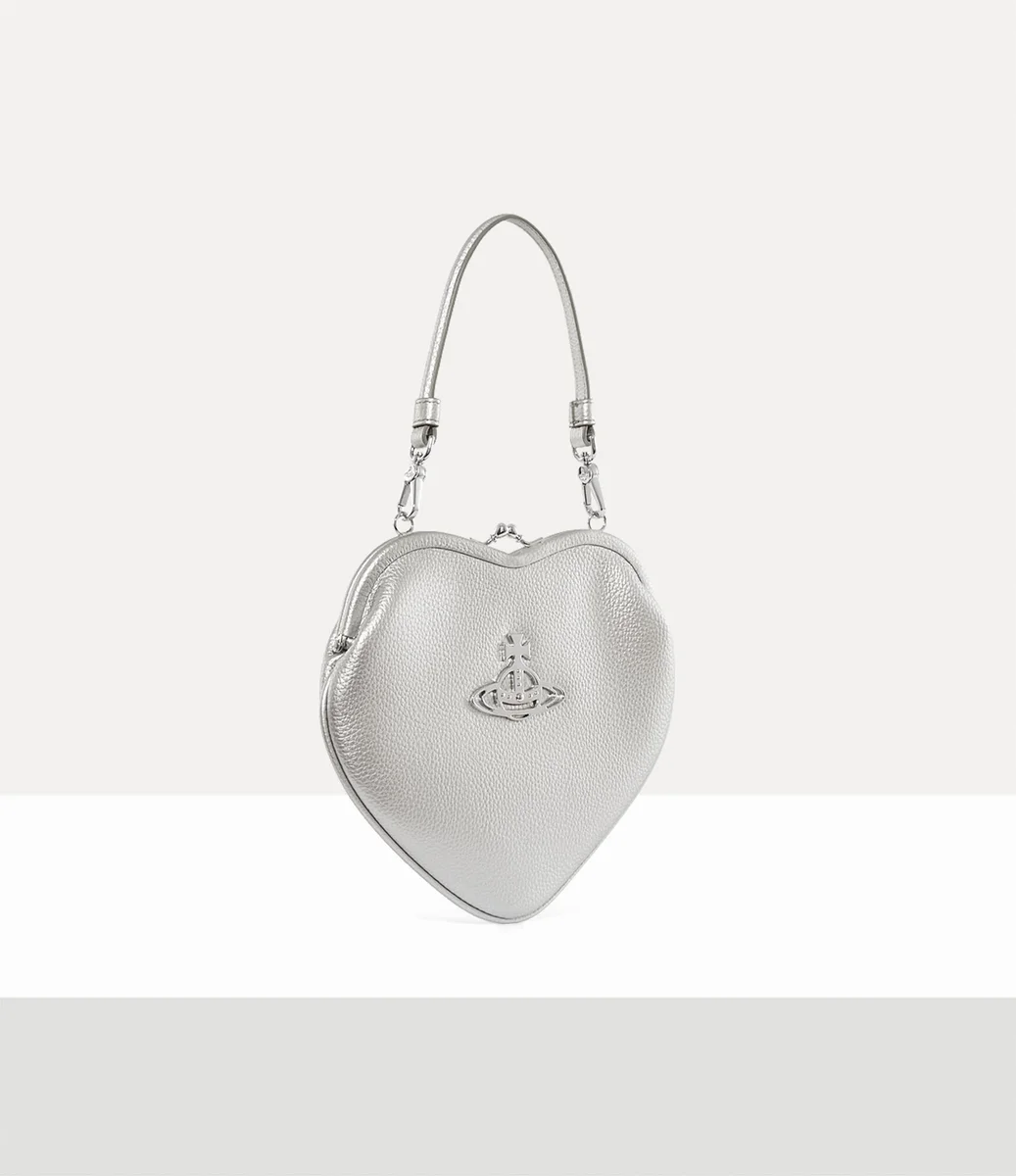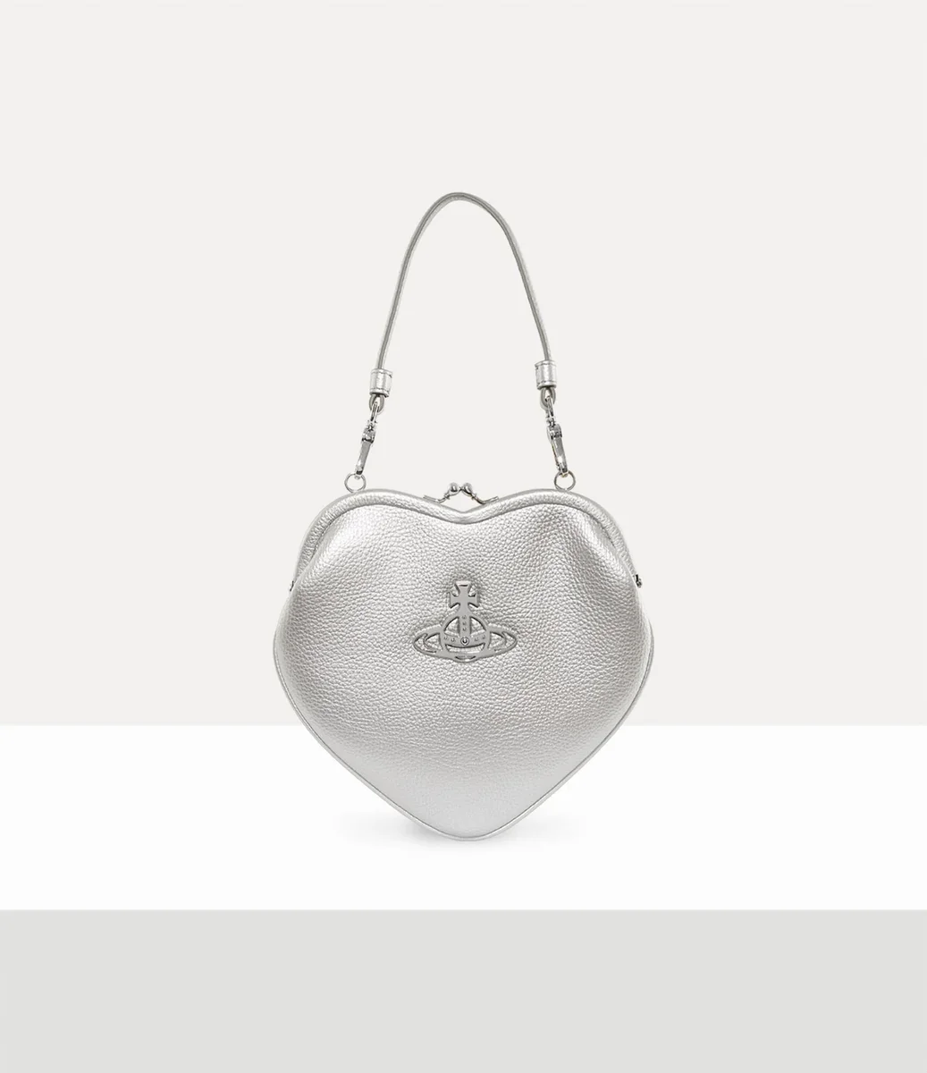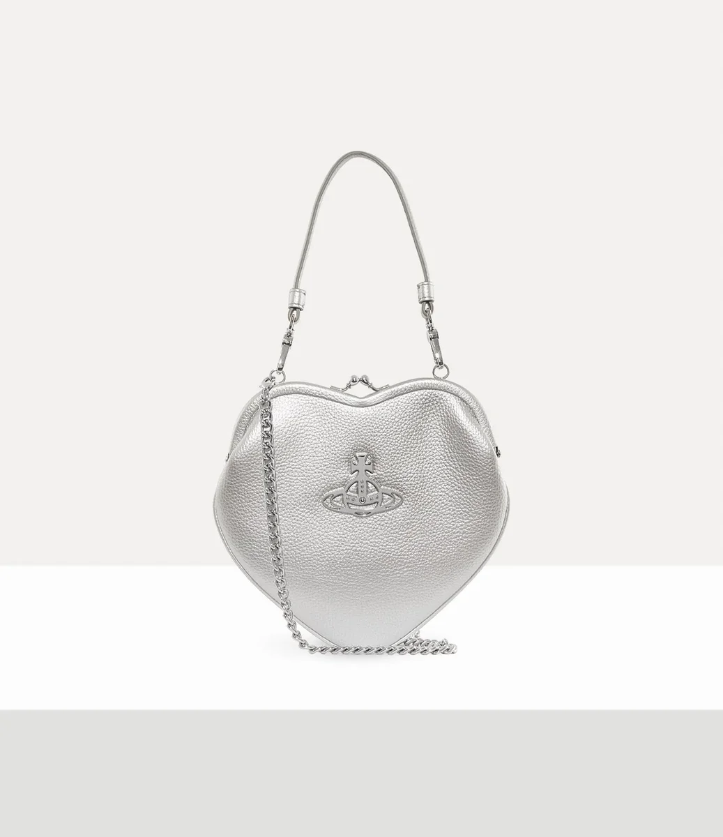 Vivienne Westwood Belle Heart Frame purse in PU leather showcases a grain-embossed silhouette, along with the house’s signature metal orb on the front panel.
