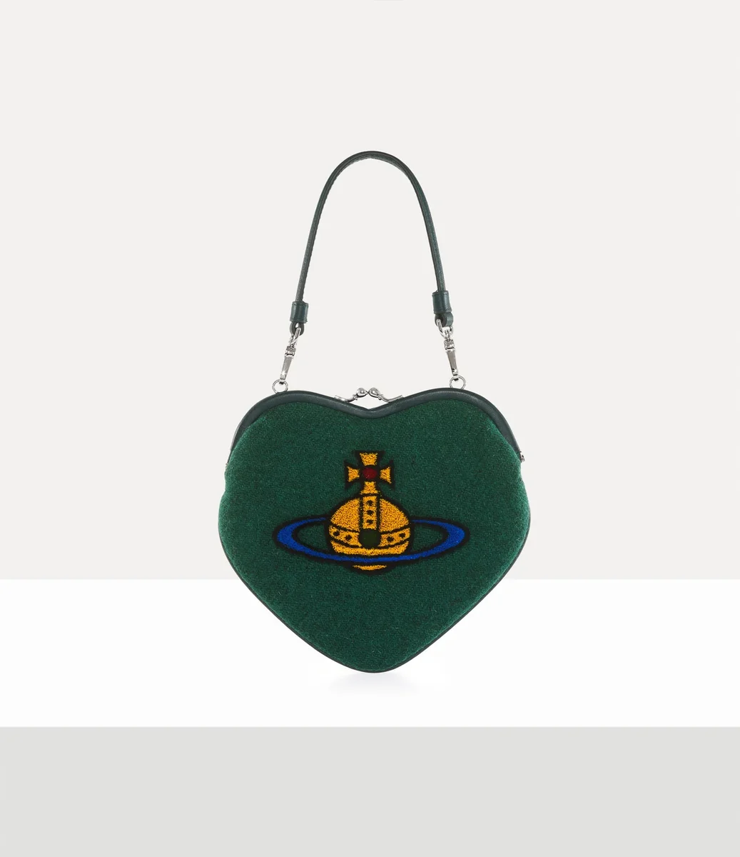Vivienne Westwood Belle Heart Frame purse, in wool features the classic heart-shaped silhouette, finished with our orb motif reinterpreted a tufted finish.