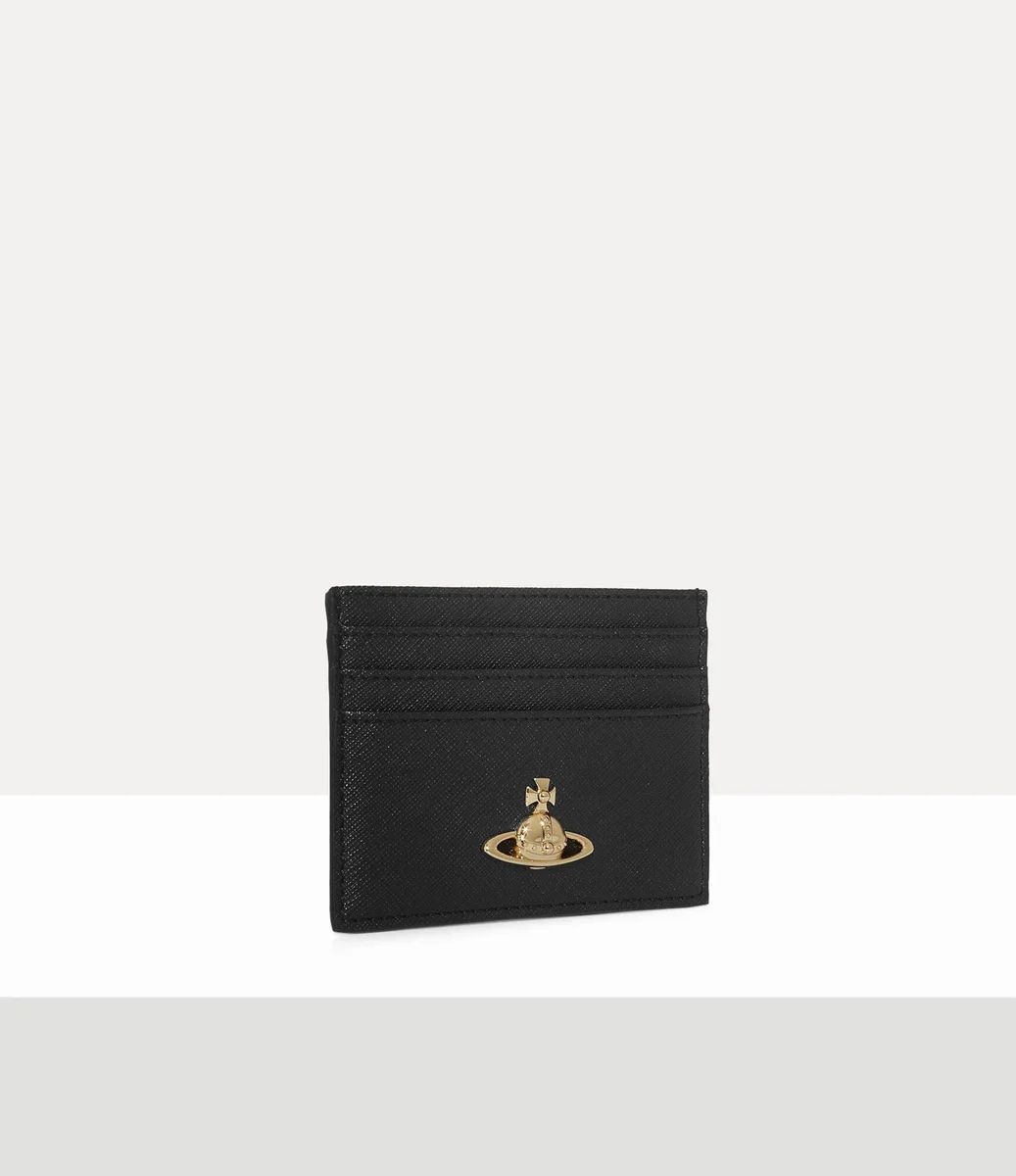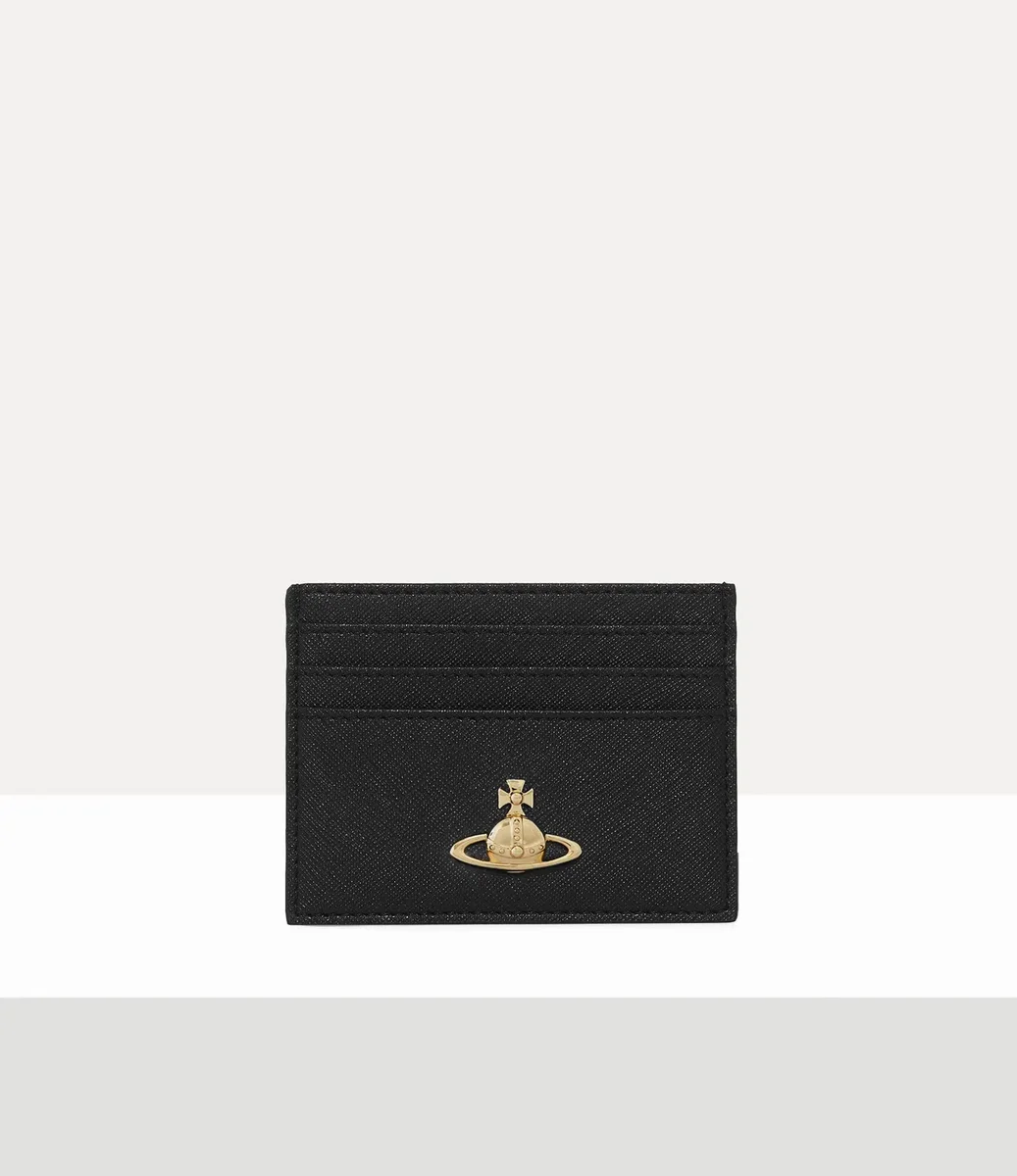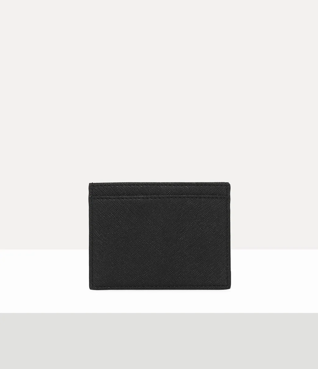 The Flat Card holder features saffiano-effect embossing across the design, decorated with tonal stitching that outlines the rectangular silhouette. The piece is adorned with a three-dimensional orb motif on the front panel of the design, which symbolises tradition, encircled by the celestial rings of Saturn, symbolising the future.
