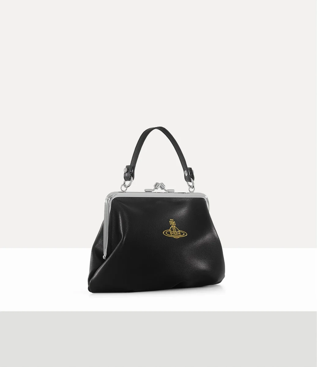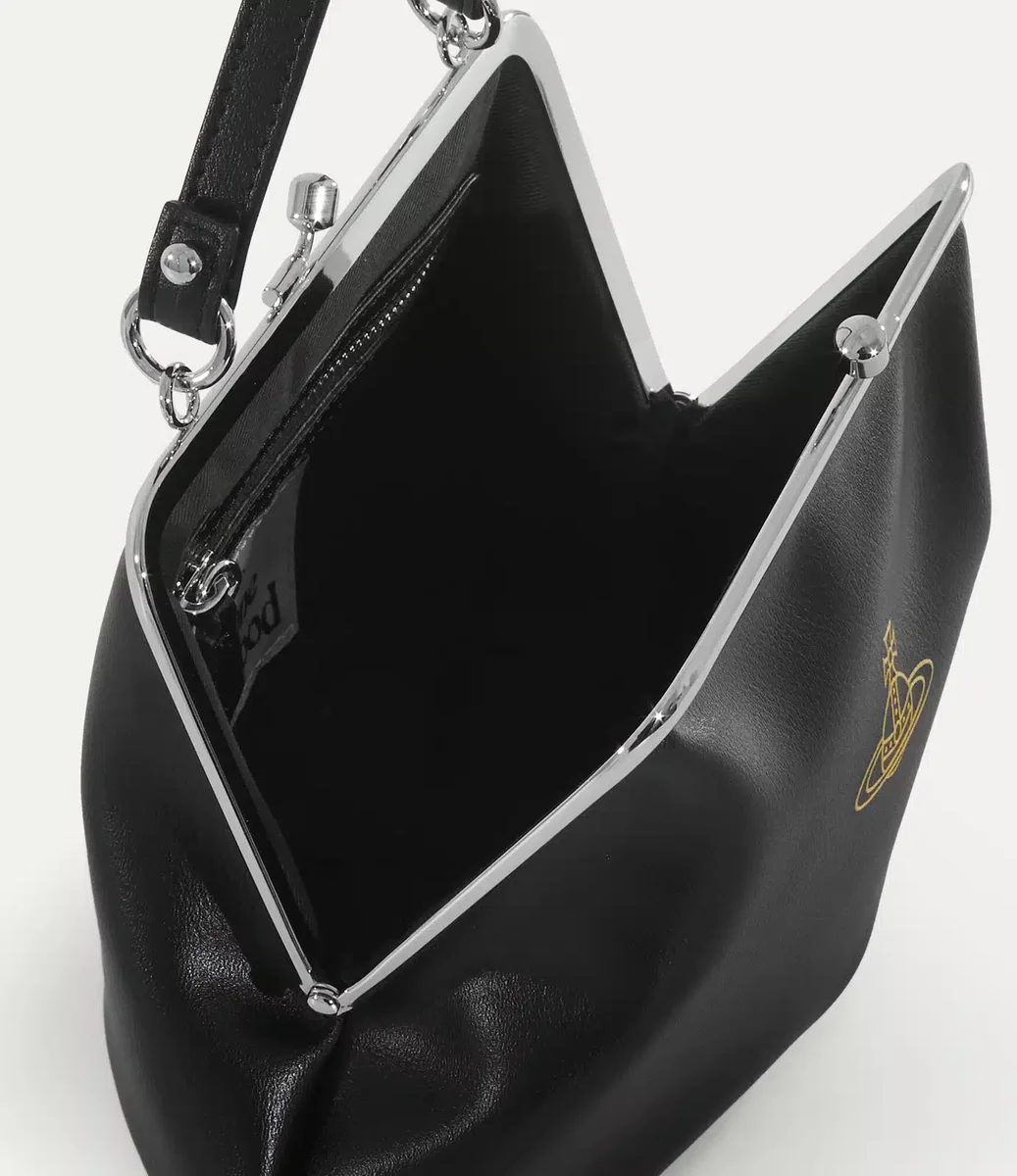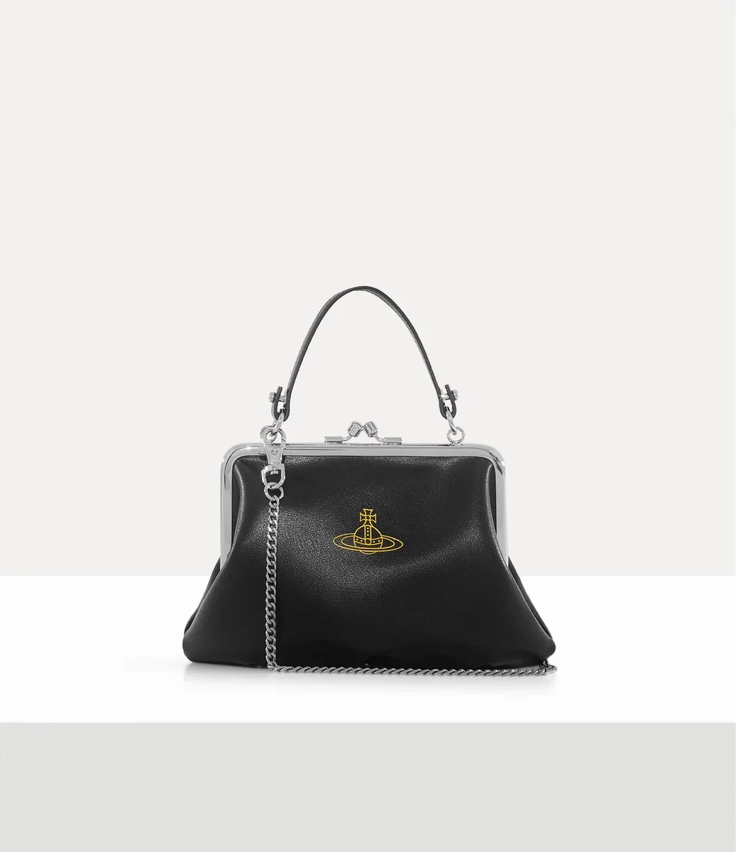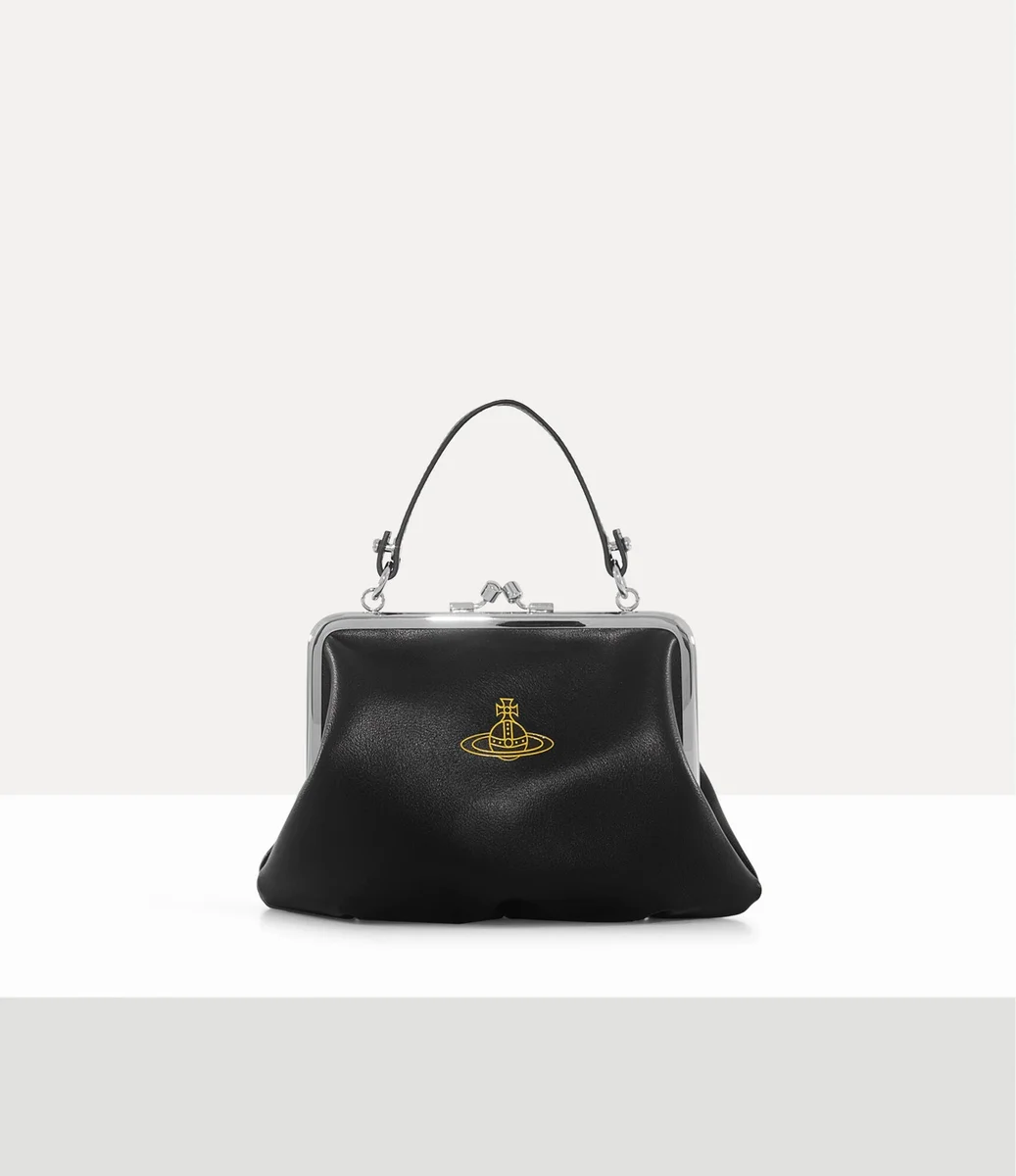 Vivienne Westwood Granny Frame purse features a polished framework and a kiss-lock clasp, complete with a smooth finish and printed orb motif on the front.