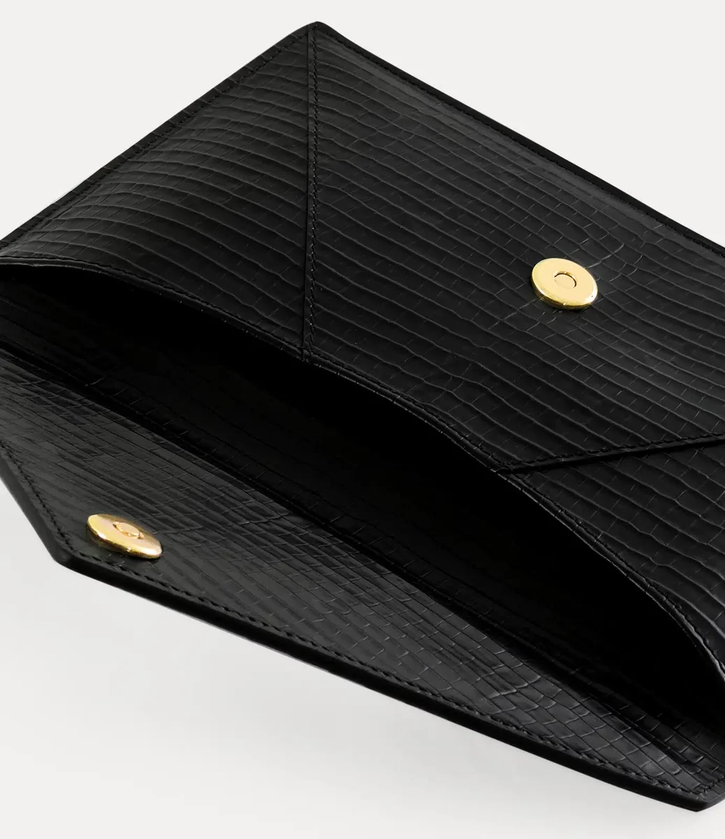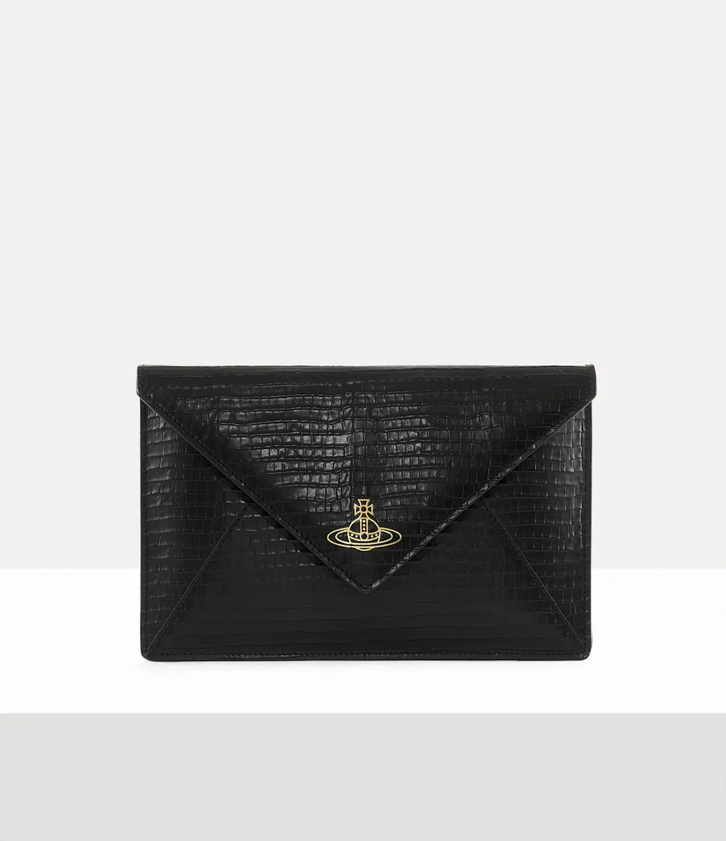 Vivienne Westwood Envelope clutch is reimagined in this season’s subtle mini croc-effect leather and is finished with a delicate gold foil embossed motif.