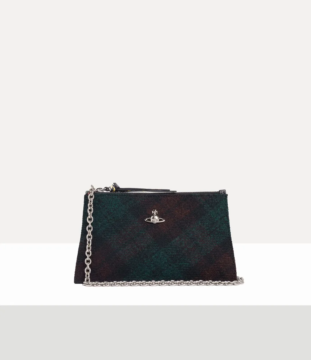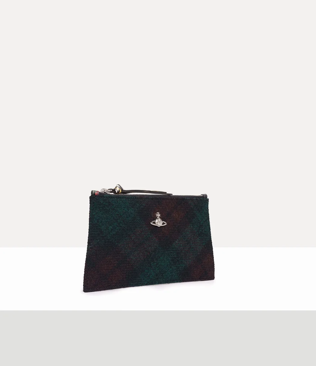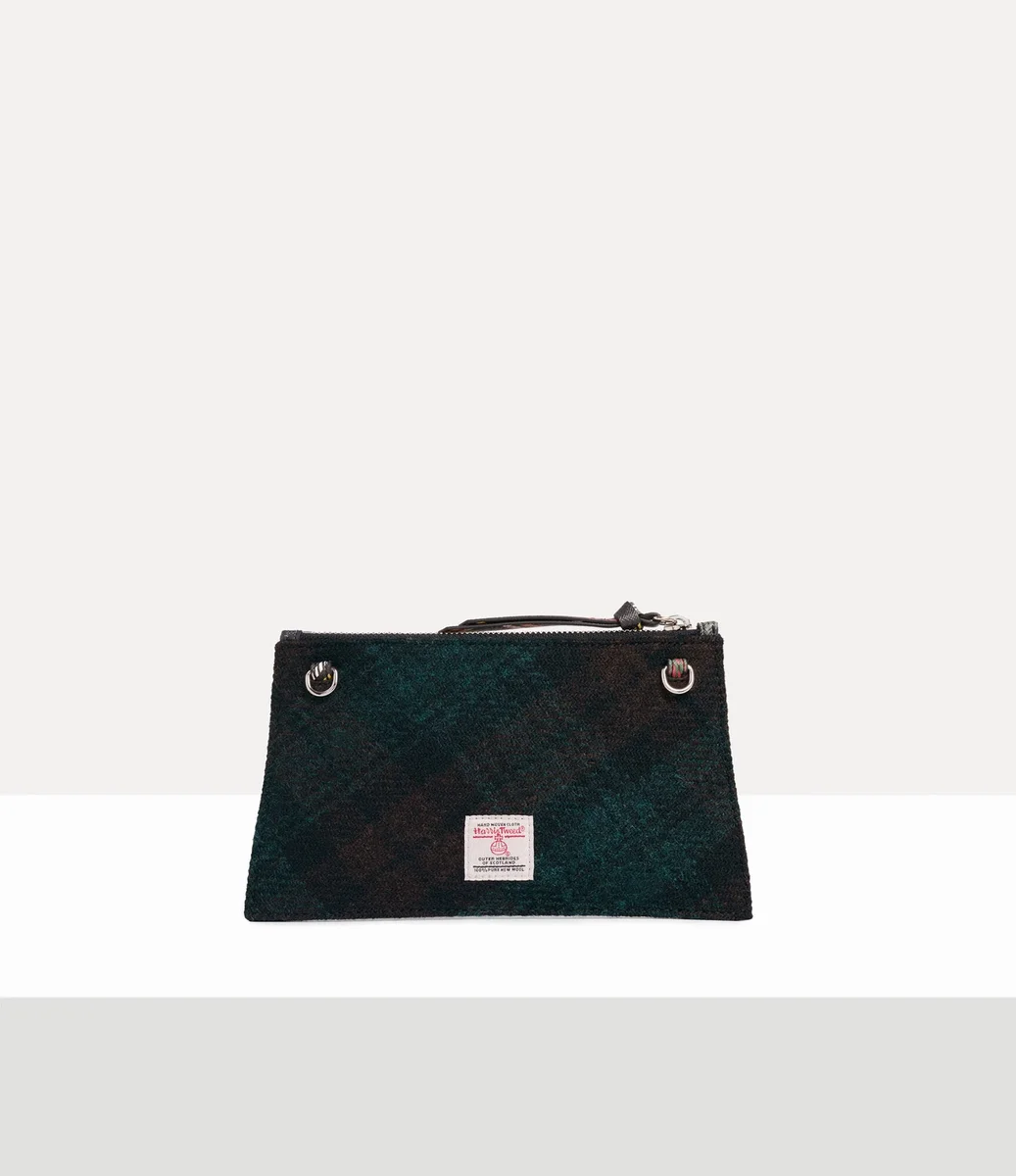 Vivienne Westwood Small Flat Zip clutch is crafted from archive Harris Tweed in dark hues, finished with a hand-embroidered orb detail.
