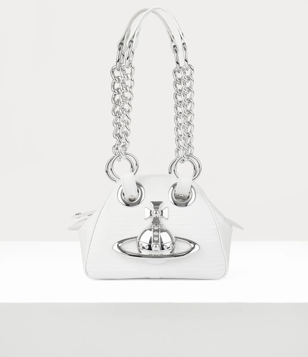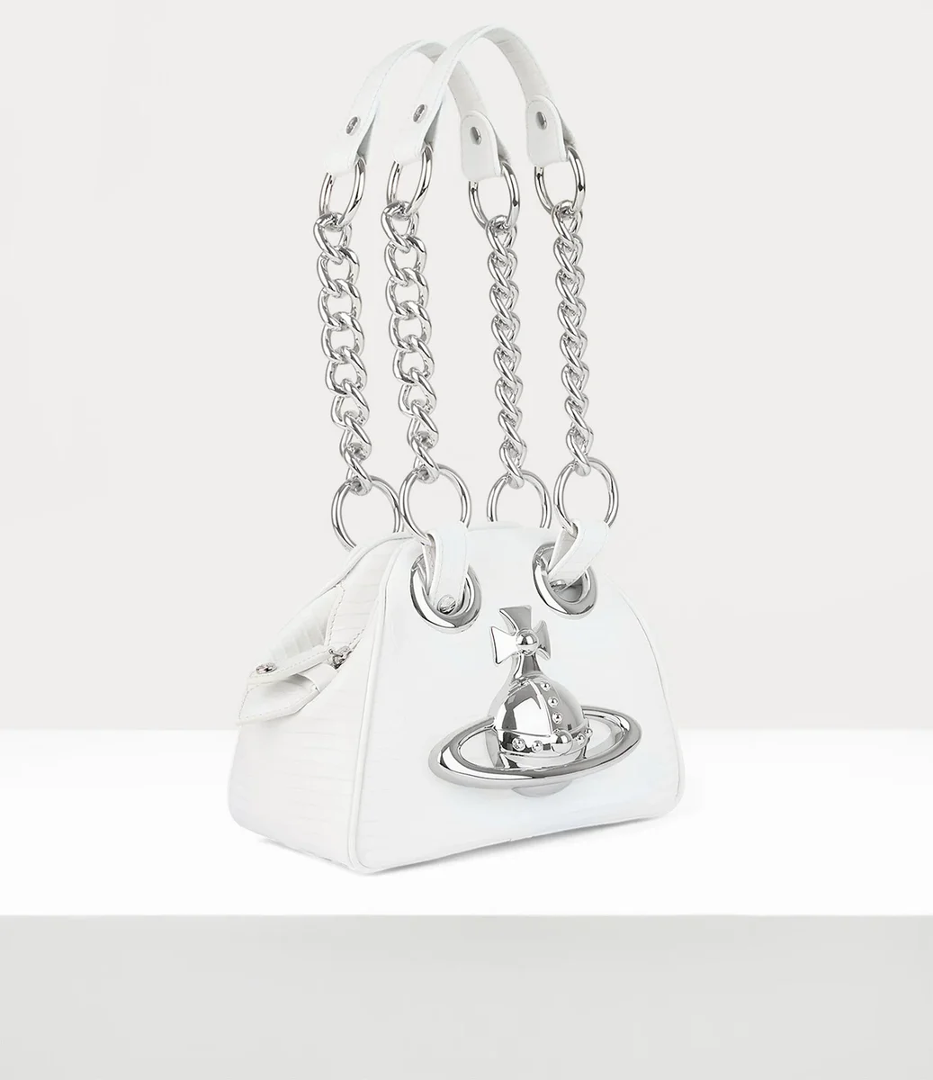 Our Archive Orb Chain handbag, first seen in the Vivienne Westwood Spring–Summer 1991 ‘Cut, Slash & Pull’ collection, has been reimagined this season in ‘Mini’ croc-effect embossed leather. The piece offers a large three-dimensional orb motif on the front panel, complete with bondage-inspired hoops and chain detailing along the straps.