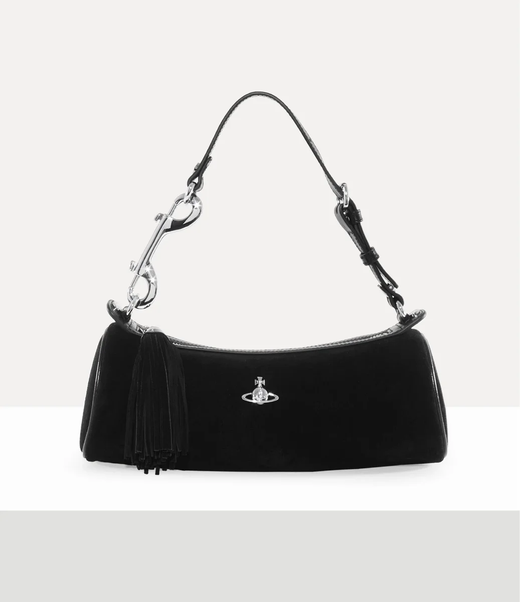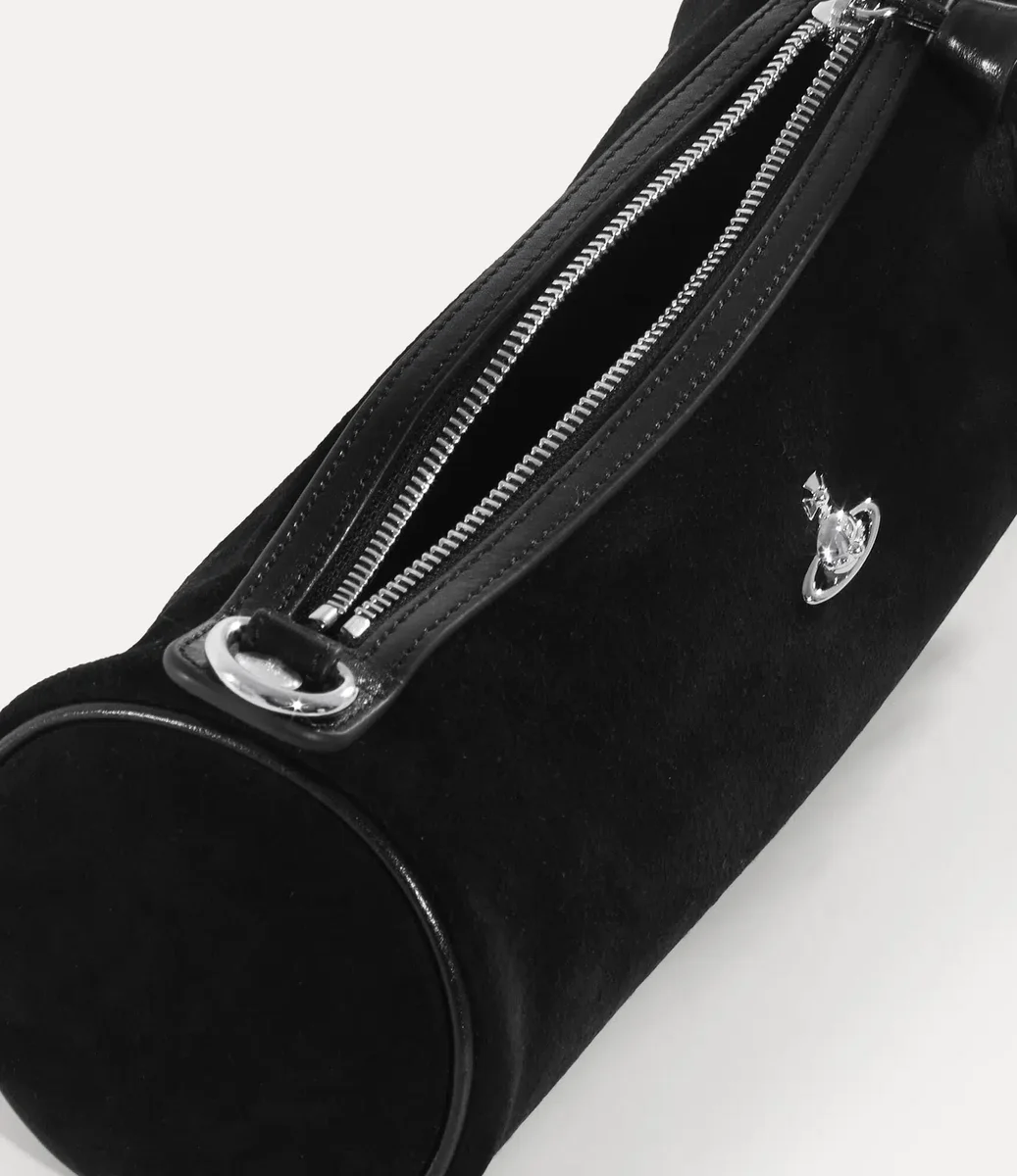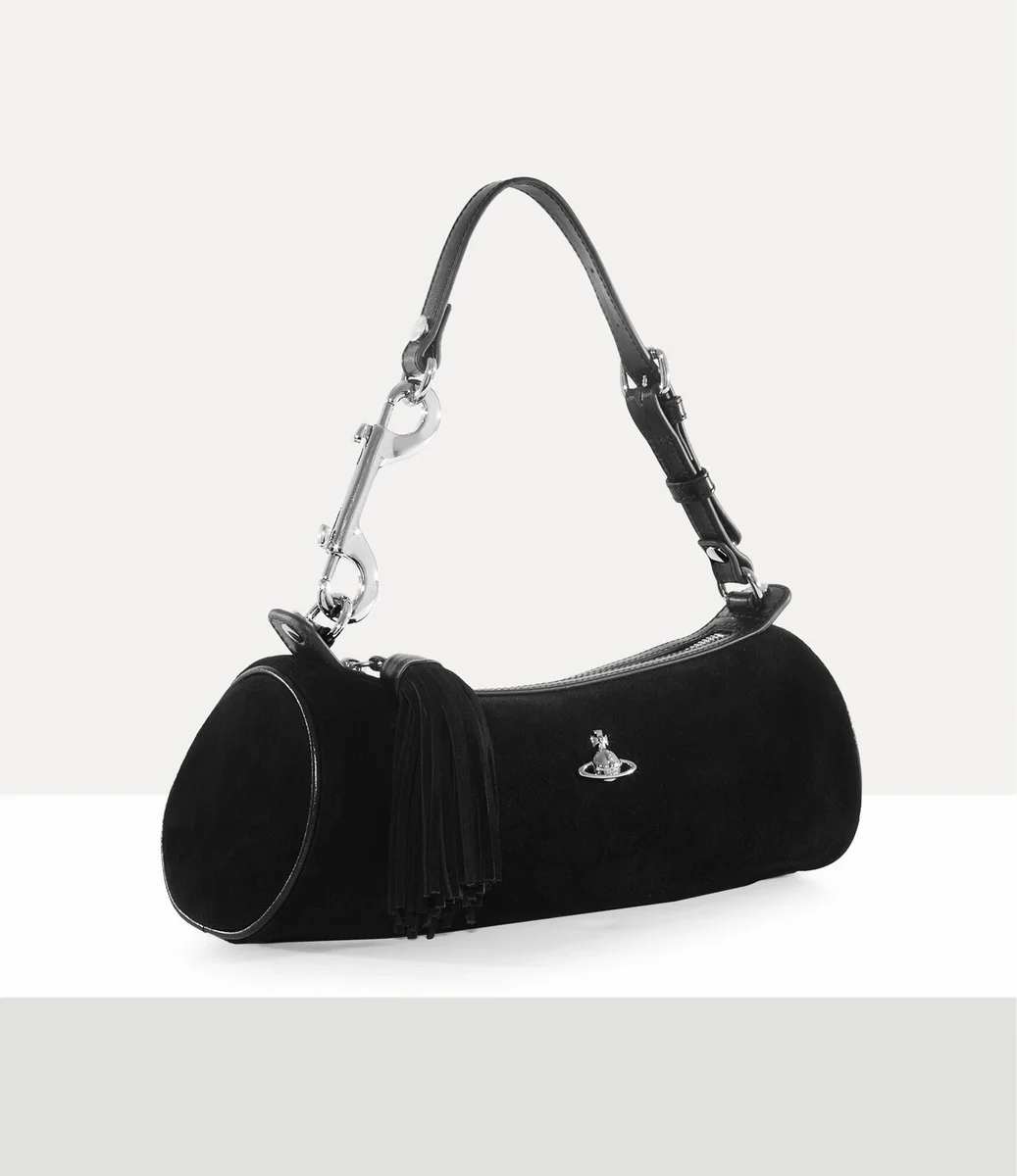 Vivienne Westwood Cindy Cylinder bag is crafted from supple suede leather and finished with the signature bas relief orb at the front of the design.