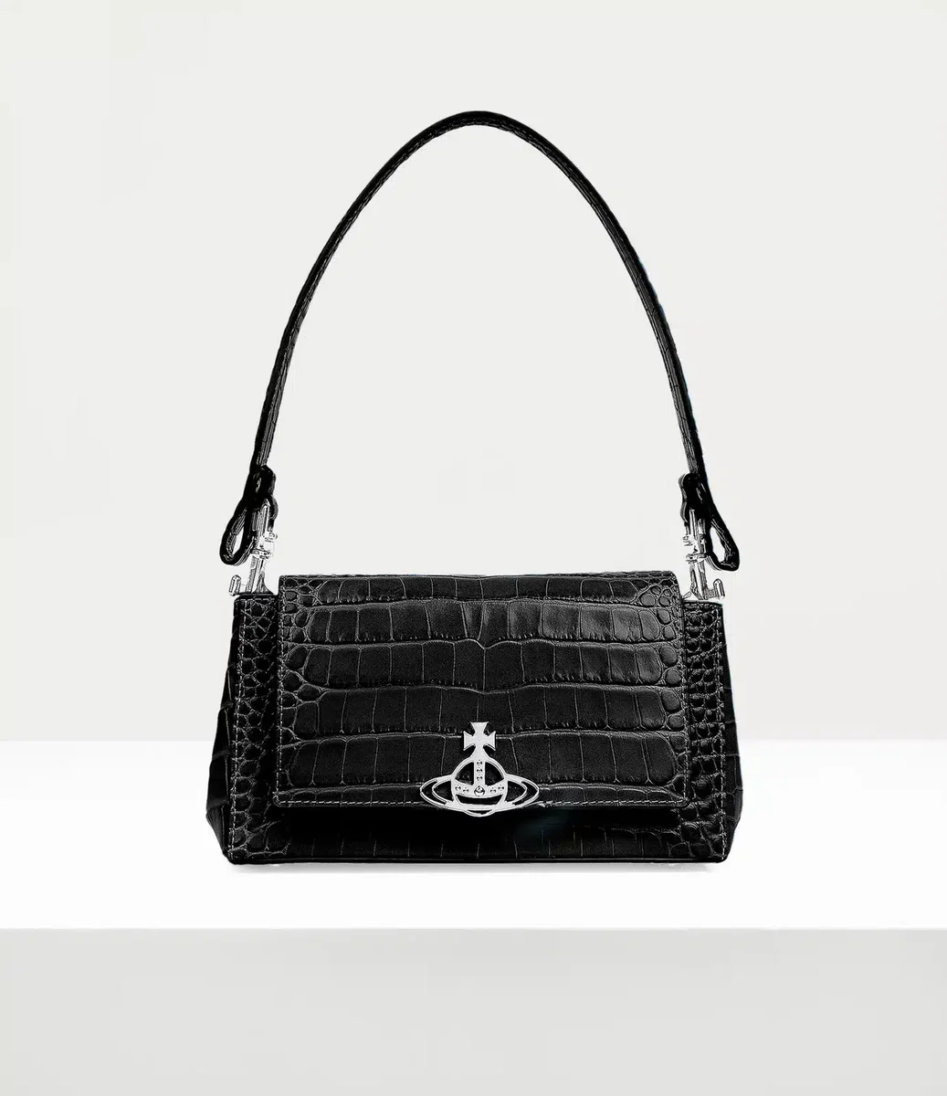 The croc-embossed Hazel Medium handbag features a ‘soft punk’ inspired baguette silhouette and opens to reveal the broken pinstripe lining and vanity mirror. The front flap closure showcases our house’s orb motif, embodying Vivienne Westwood’s vision of blending the past with the future.