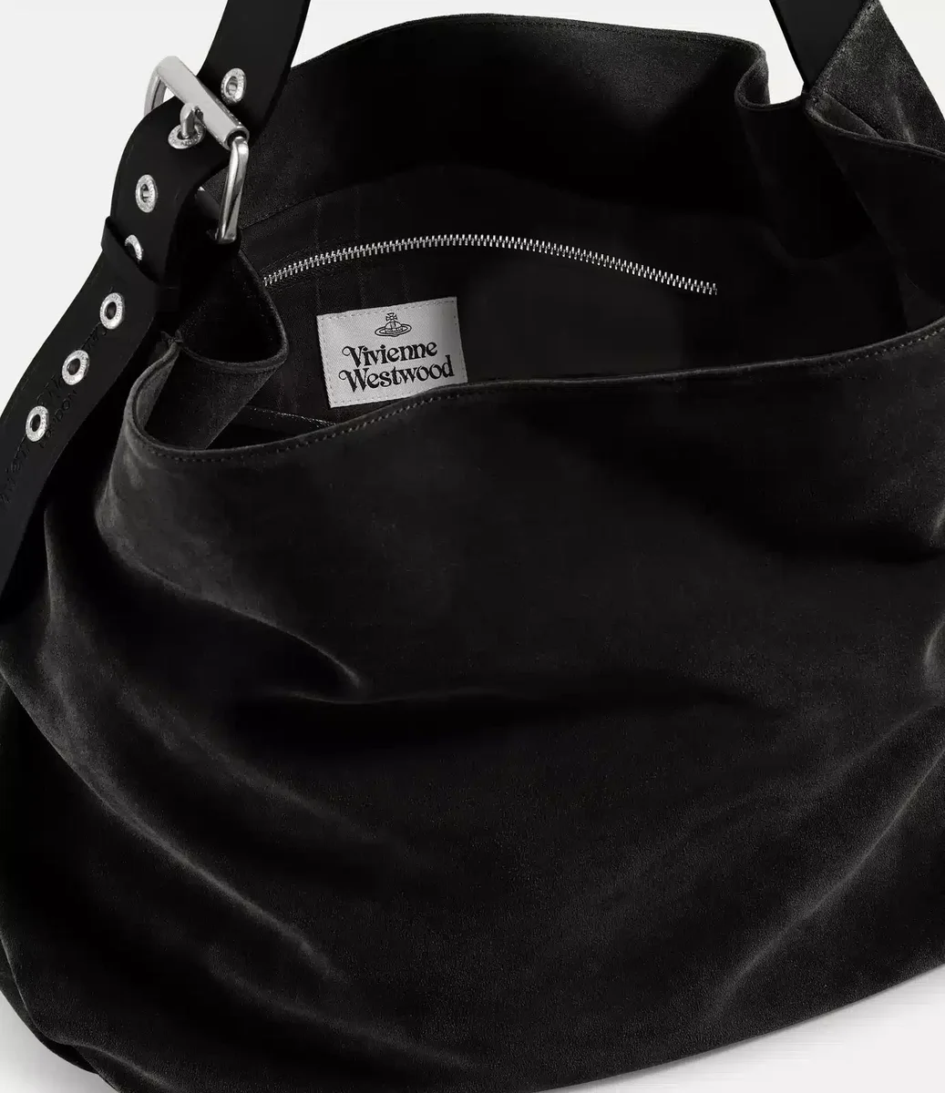 Vivienne Westwood Maxime Large Shoulder bag, in suede, has a slouchy silhouette inspired by the classic Alex belt and finished with embossed silver foil.
