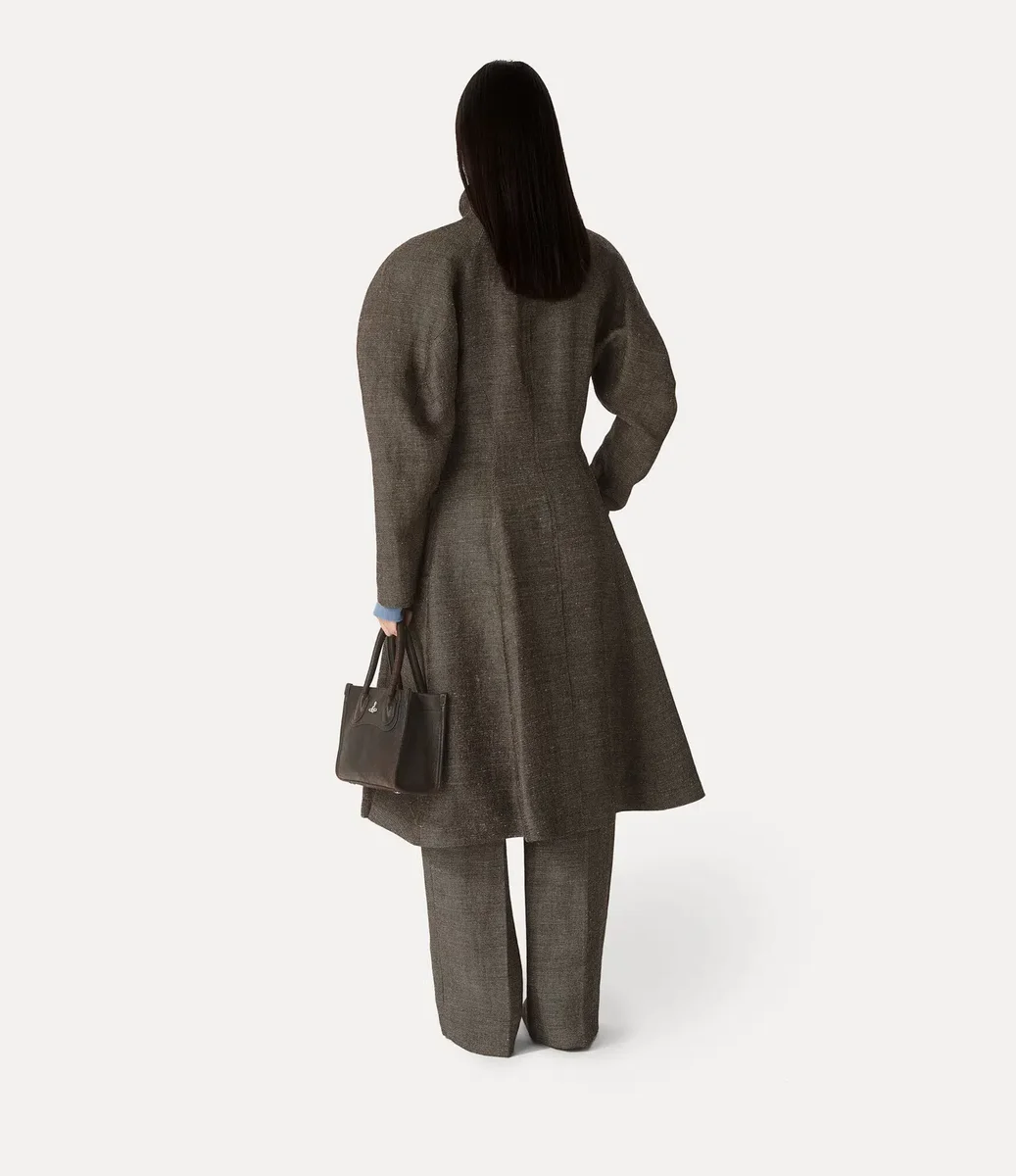 The Breeze coat is tailored from a linen–cotton twill with a soft, flannel-like texture that gives the piece an archival and rustic aesthetic. Cut with a bold asymmetric silhouette, the piece features an off-centre row of buttons that fasten the wrap-front construction, sculpting the waist before falling into a subtle flared hem.