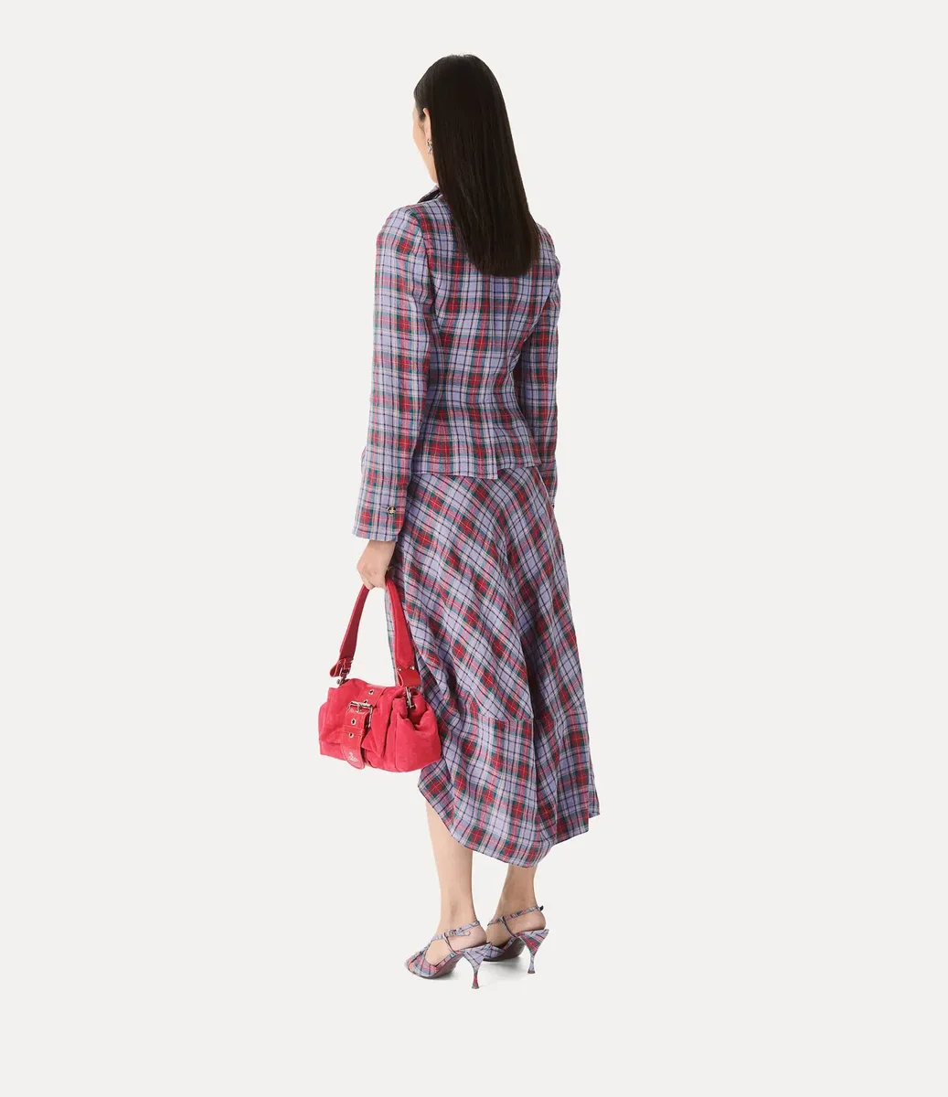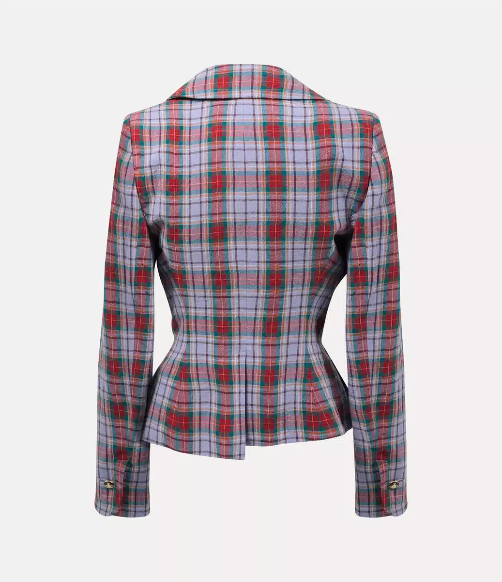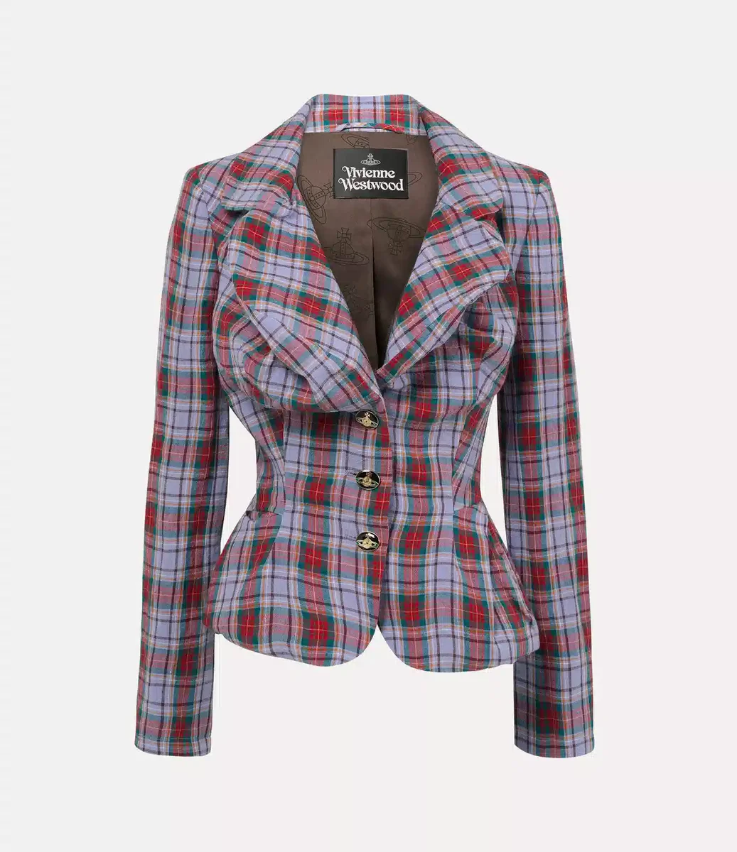 Our Drunken jacket employs Vivienne’s original experimental drunken tailoring pattern cutting system – where garment elements are distorted assuming an almost surreal shape. The piece is offered in the bold ‘Louth Tartan’ motif, woven in red, green and purple hues.