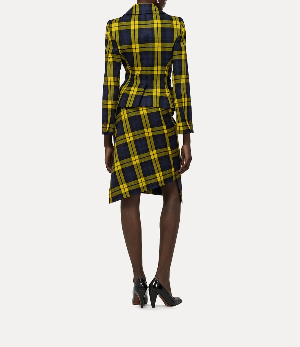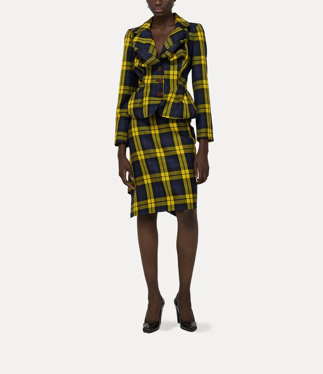 The Drunken jacket employs Vivienne’s original experimental drunken tailoring pattern cutting system – where garment elements are distorted assuming an almost surreal shape. The piece offers this season’s woollen ‘Moonshine’ tartan, complete with vibrant hues and a front-button design.