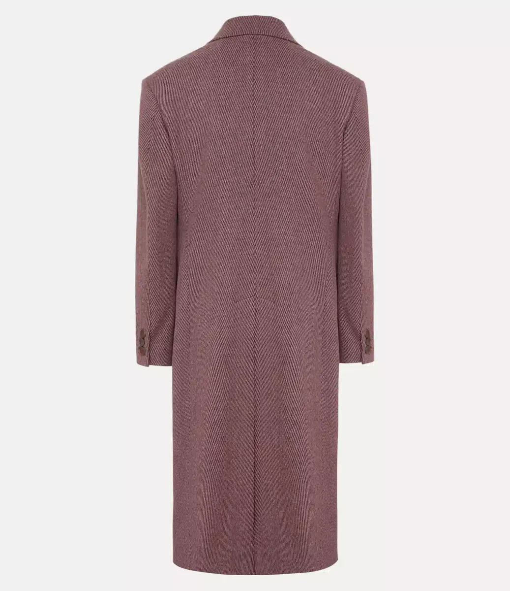 Our Winston coat features a textured wool profile, complete with a diagonal twill weave in a muted burgundy tone. The piece offers a double-breasted front with wide peak lapels, finished with secure button-front fastenings.