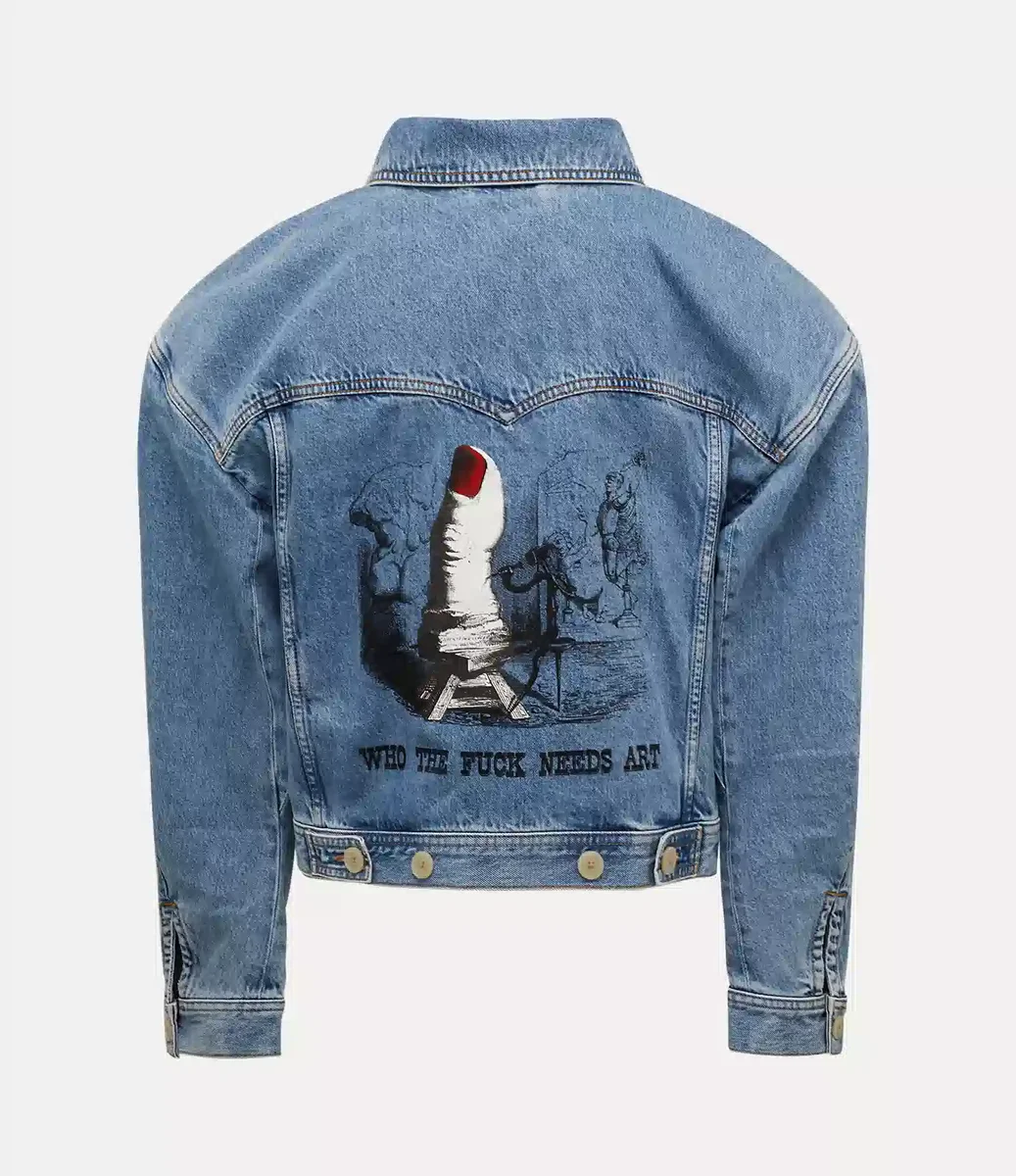 Our Worlds End Denim Boxer jacket features an athletic-inspired silhouette with oversized pockets and lowered shoulder seams. The back of the design is printed with the house’s archival ‘Who the Fuck Needs Art’ slogan from Vivienne Westwood’s Spring-Summer 2006 ‘Propaganda’ Collection, reflecting her punk roots and commitment to challenging political conventions.