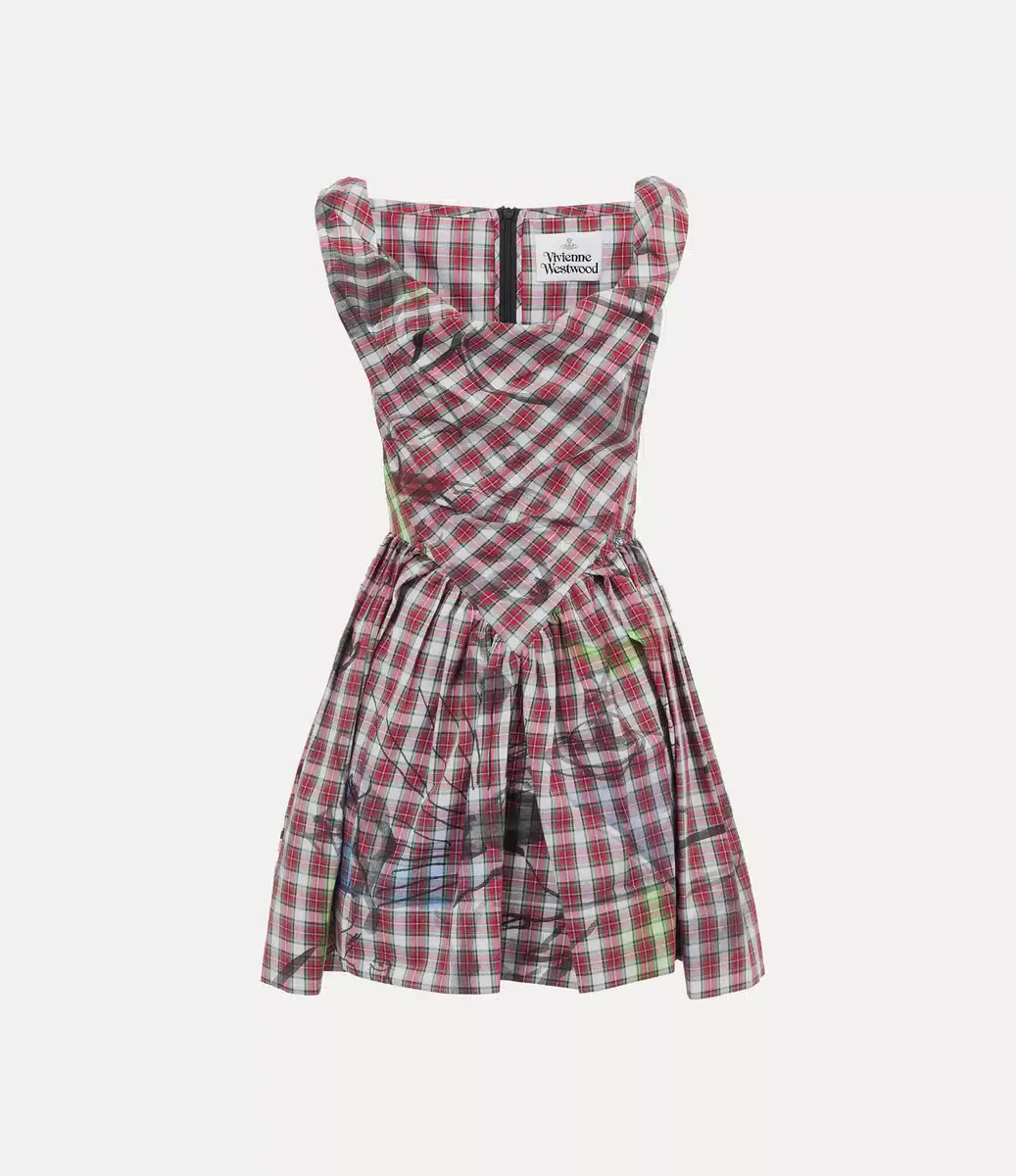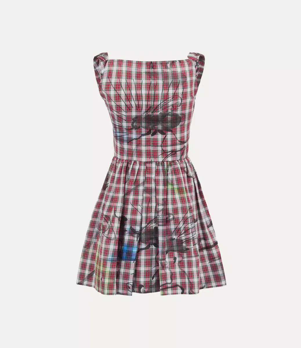 Vivienne Westwood Mini Sunday dress is cut from cotton and adorned with a printed red tartan check motif, evoking a classic homespun aesthetic.