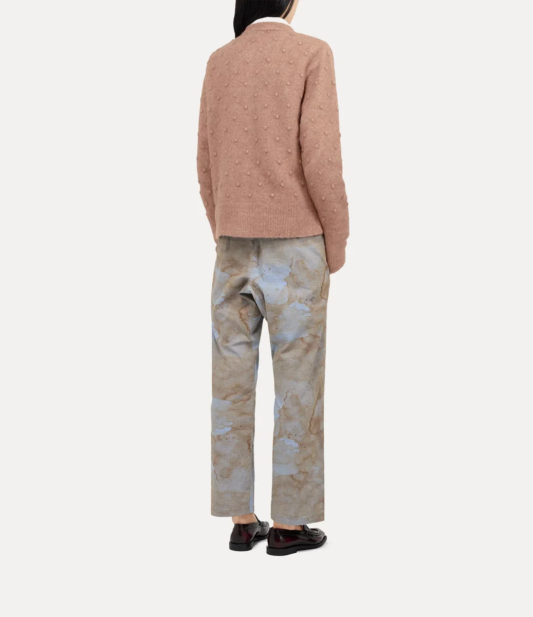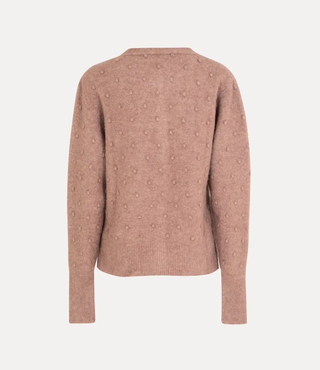 The Rubina cardigan is crafted from a soft alpaca wool blend and features a playful bobble-knit texture throughout the design. The piece offers classic crew neckline with ribbed detailing, embroidered with a multi-coloured orb logo near the hem, which symbolises tradition, encircled by the celestial rings of Saturn, symbolising the future.