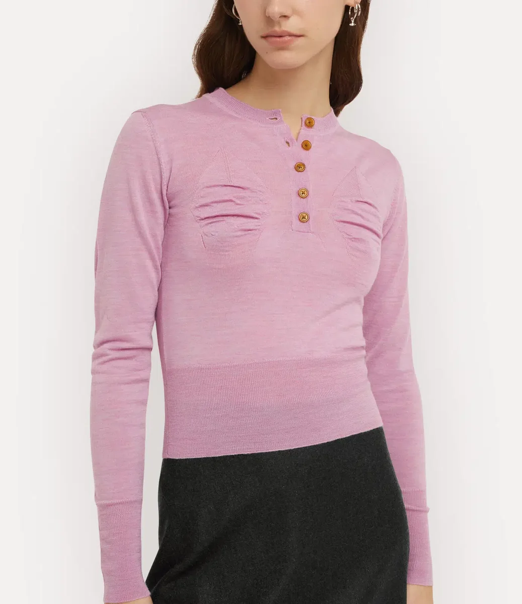 Our Tit jumper features sculptural stitch detailing that contours the chest, echoing the avant-garde silhouettes of Vivienne’s Autumn–Winter 1995 ‘Vive la Cocotte’ collection. Enhanced with ribbed trims, the piece is adorned with an embroidered orb at the back.