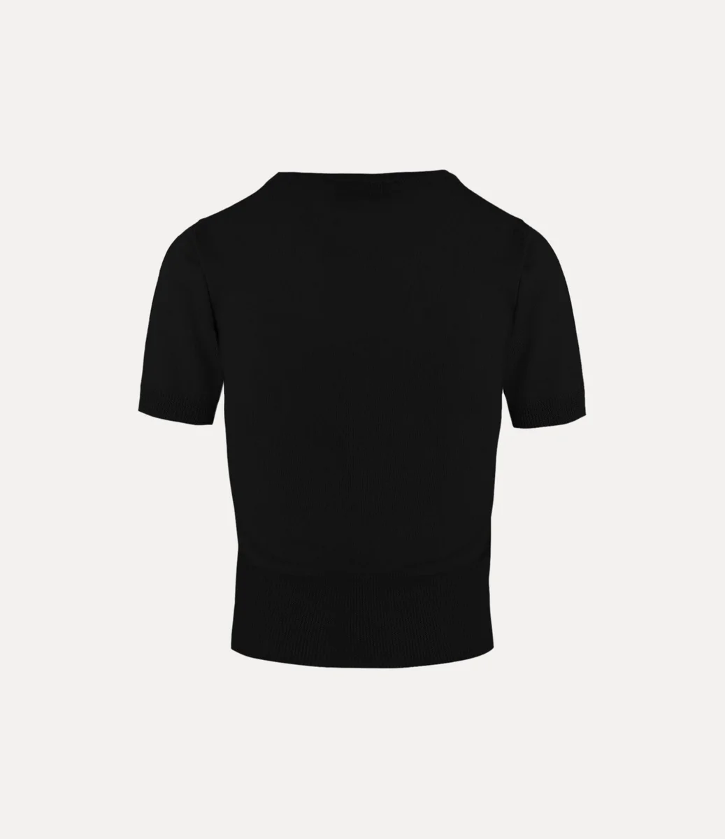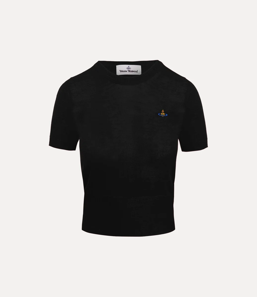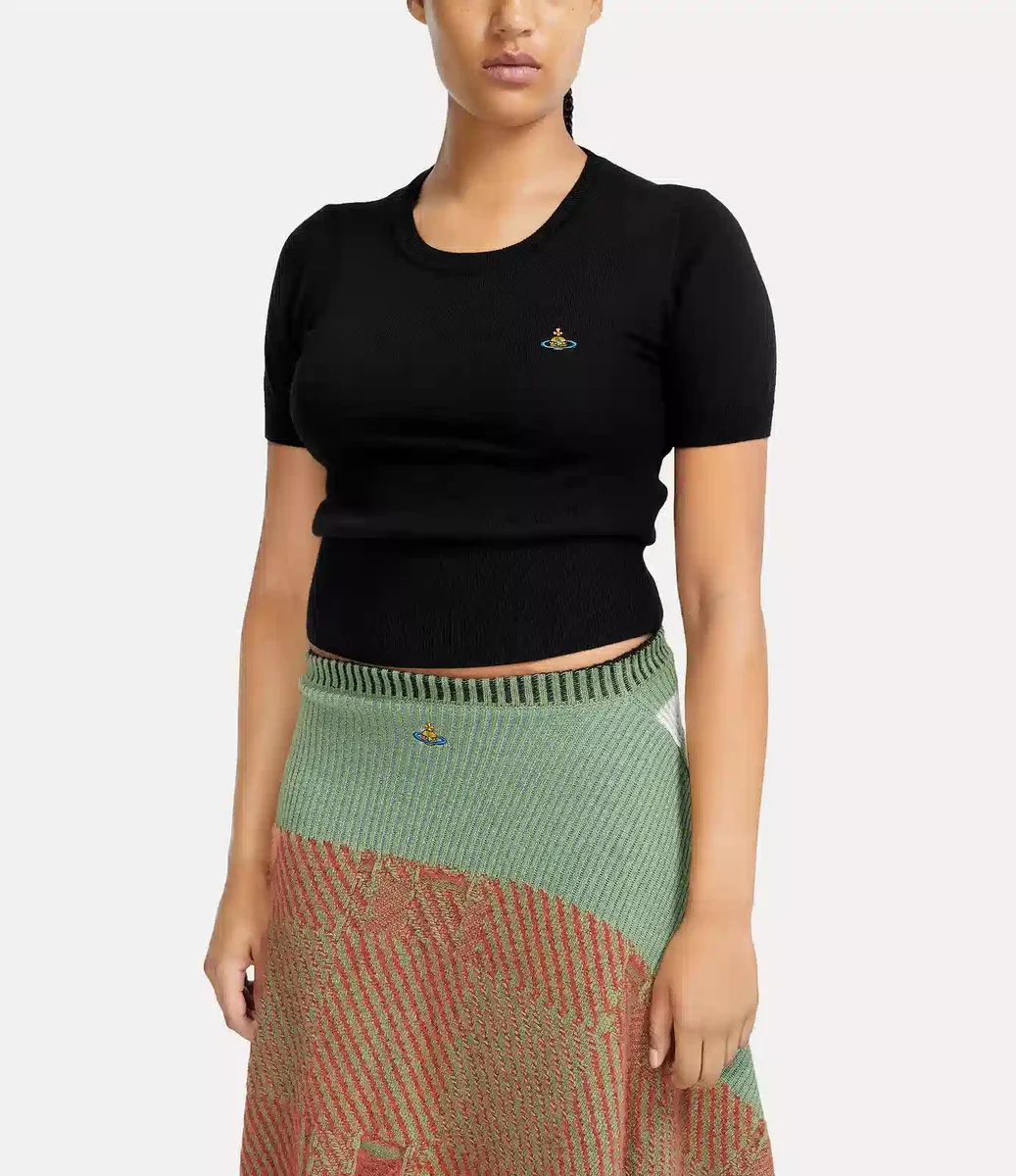 Our Bea top has been refreshed this season. Forming part of our classic collection, this short-sleeved top in cotton cashmere features ribbed trims and an embroidered multi-coloured orb on the chest – synonymous with Vivienne’s vision of launching tradition into the future.