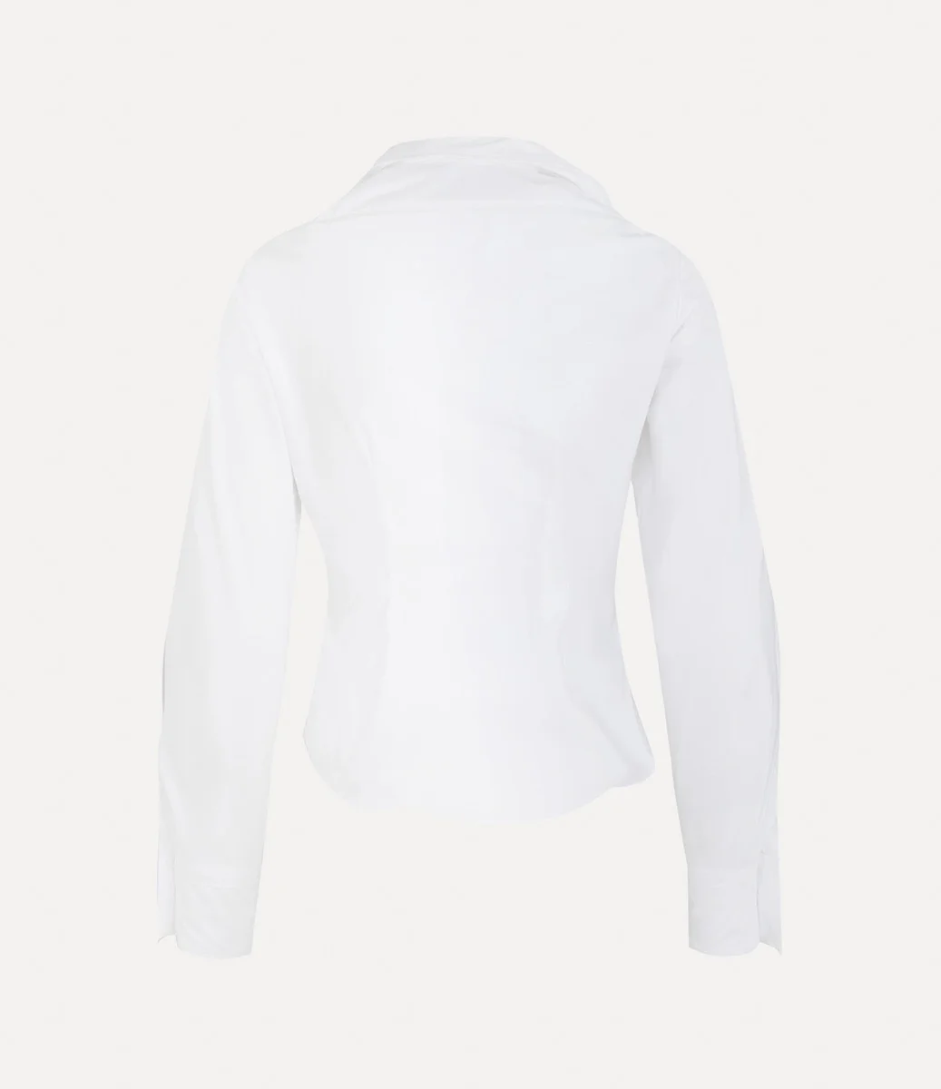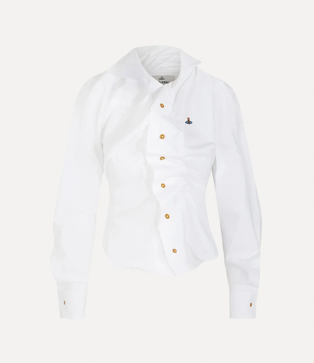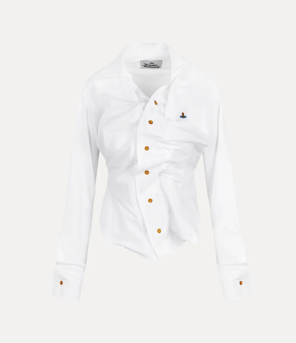 Vivienne Westwood Drunken shirt, in cotton, adopts an off-centre button placket with an asymmetrical hemline, complete with a buttoned closure.