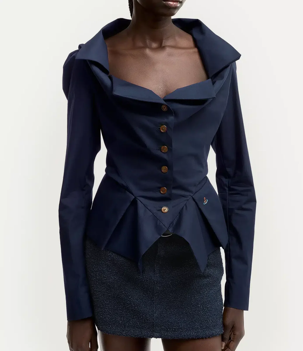 Our Monday shirt offers origami-like folds of fabric around the neckline, adorned with letter-engraved button fastenings and our signature multi-coloured orb embroidery at the hip. The piece offers a fitted bodice with a flared, pleated fabric extension at the waist, finished with elegantly puffed shoulders.