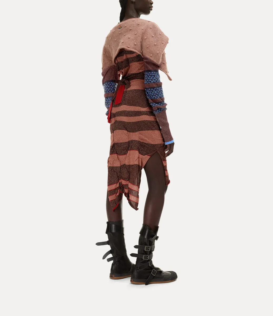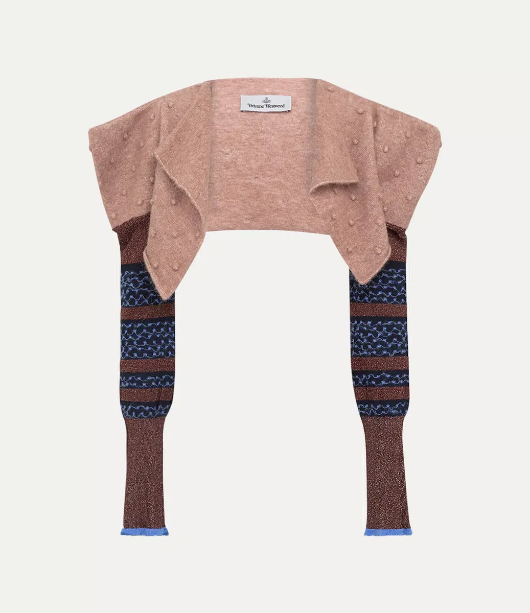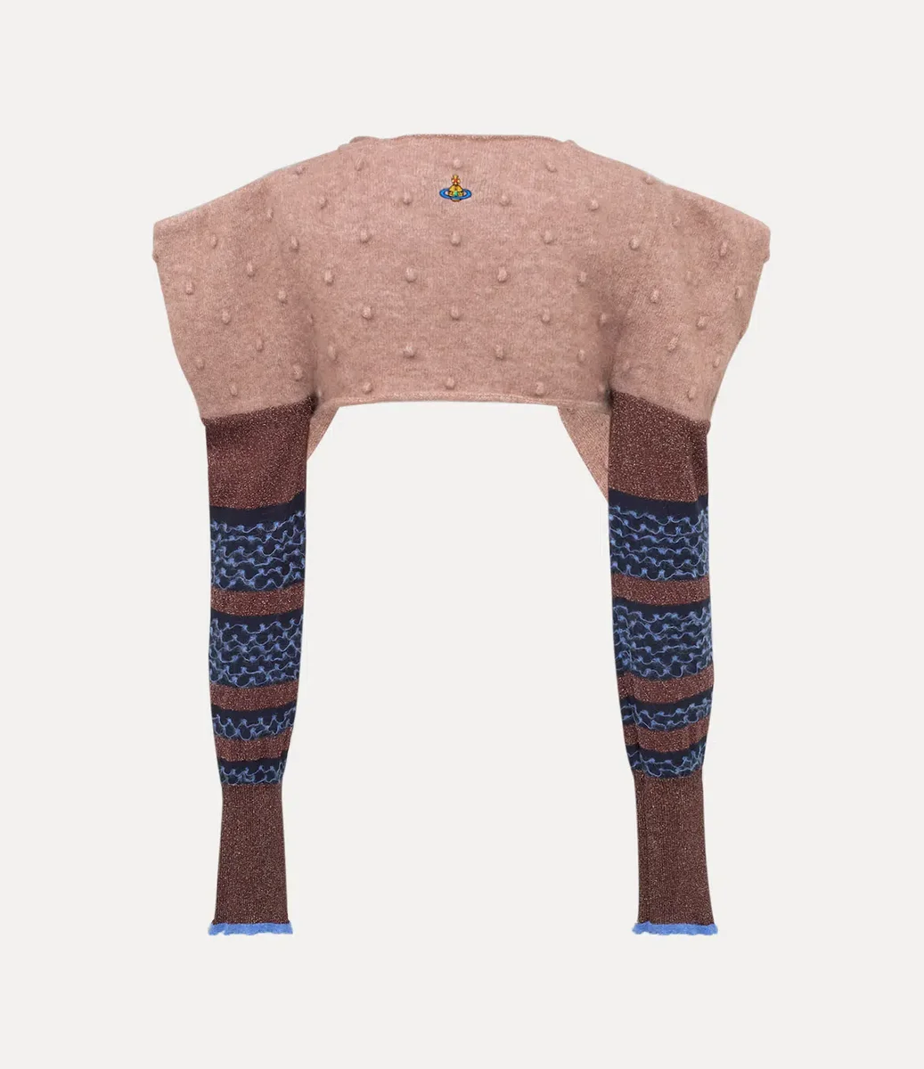 Our Rubina bolero is crafted from a soft alpaca wool blend and features a playful bobble-knit texture across the upper body. Designed with a wide boat neckline and sculptural shoulders, the piece is finished with multi-textural, fitted sleeves that contrast with the cropped silhouette.