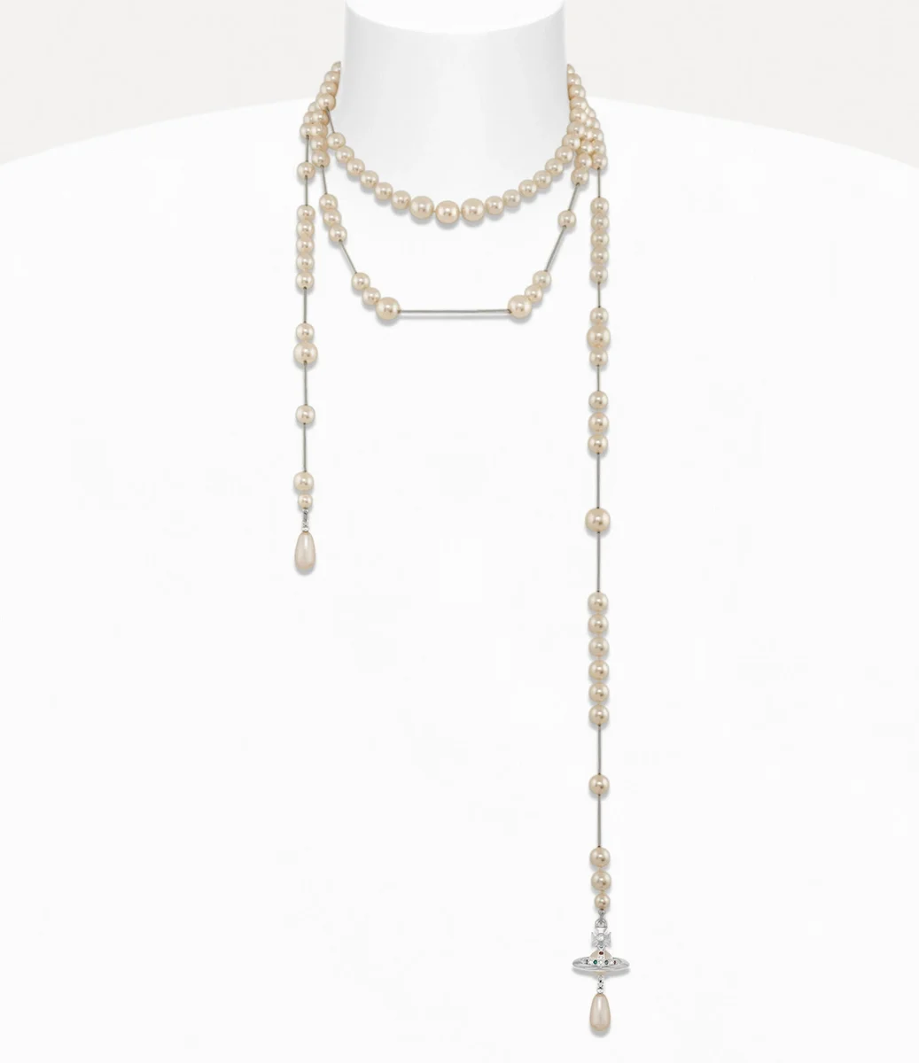 Pearls are an essential element of the house’s iconography, evoking a sense of grandeur and luxury. The Broken Pearl necklace was first introduced in the ‘Storm in a Teacup’ collection form Autumn-Winter 1996-97, inspired by the decorative schemes of Rococo art. This piece features glass pearls, with Vivienne’s signature ‘Broken’ elements, designed for women who were ‘facing up to the horror of uniformity and minimalism’.