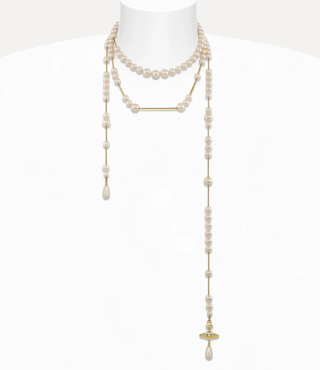 Pearls are an essential element of the house’s iconography, evoking a sense of grandeur and luxury. The Broken Pearl necklace was first introduced in the ‘Storm in a Teacup’ collection form Autumn-Winter 1996-97, inspired by the decorative schemes of Rococo art. This piece features glass pearls, with Vivienne’s signature ‘Broken’ elements, designed for women who were ‘facing up to the horror of uniformity and minimalism’.