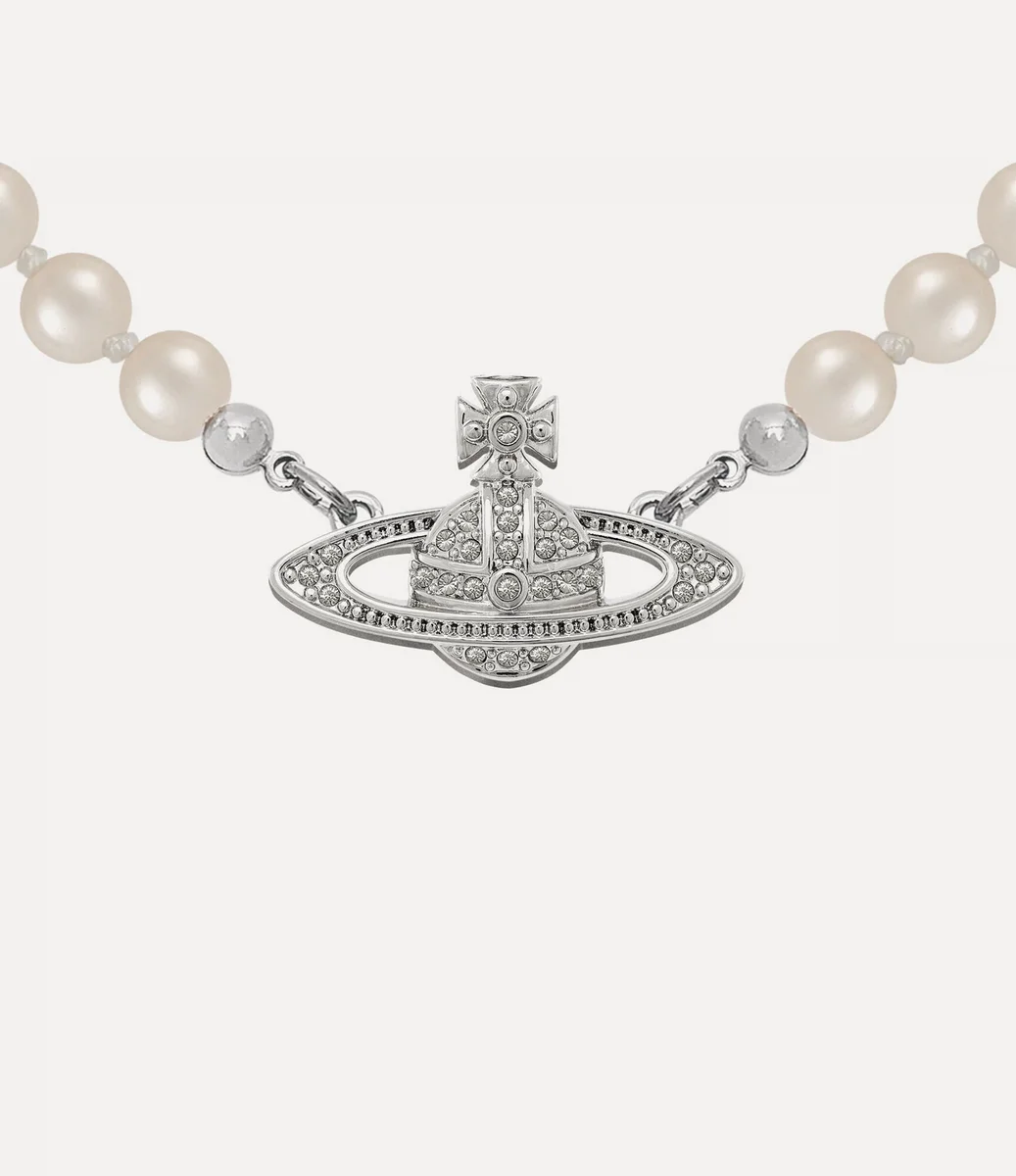 In the late 1980s, Vivienne Westwood introduced her iconic pearl concept at the Harris Tweed Fall 1987 fashion show, featuring a single-strand choker. Our Mini Bas Relief Pearl choker takes inspiration from this original design, reimagining it with the classic orb motif at the centre, enhanced by glistening crystals – recalling the house’s ethos of linking the past with the future.