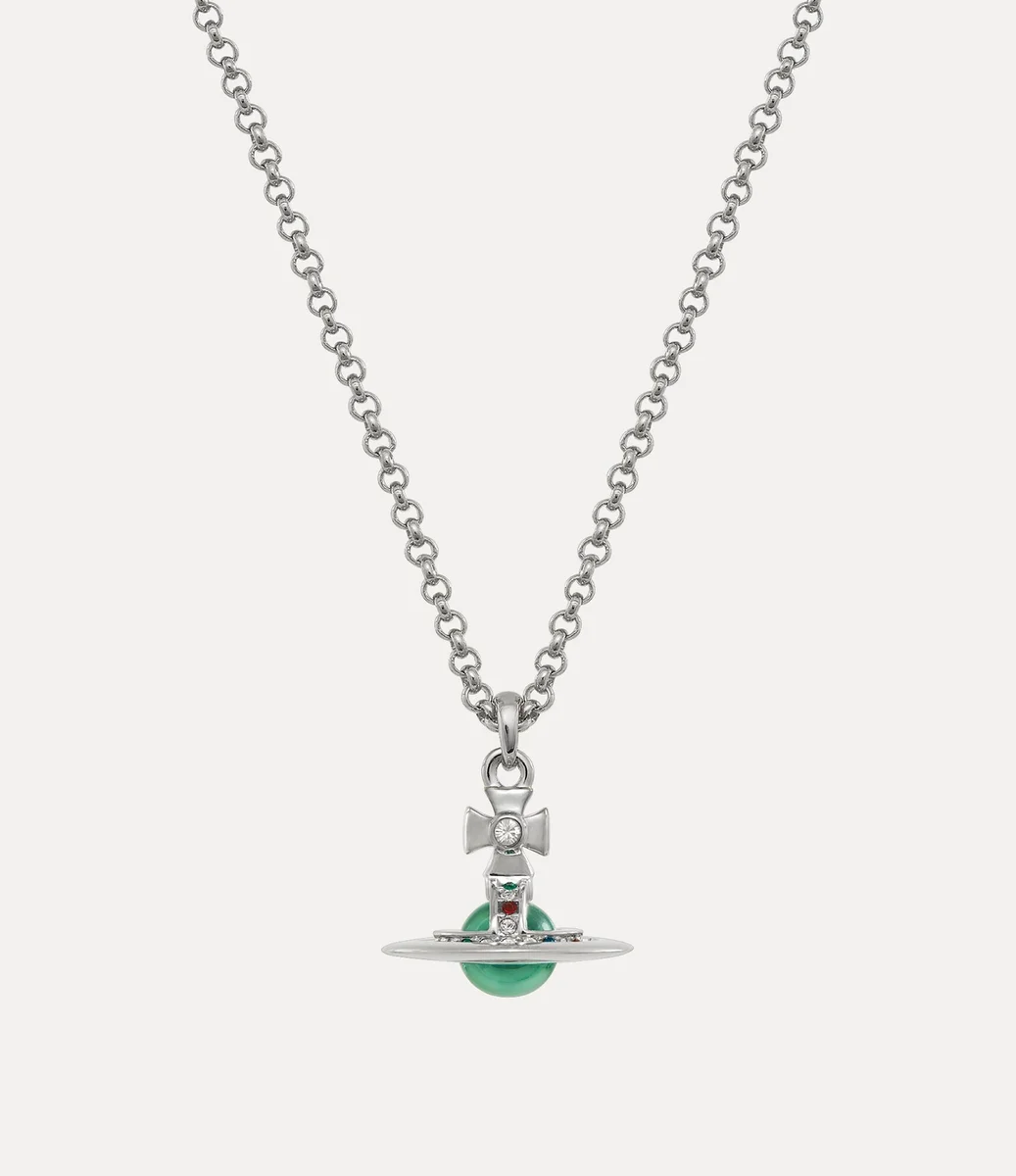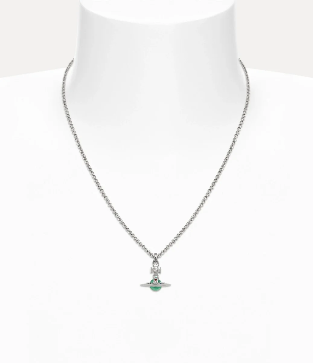 Vivienne Westwood New Petite Orb Pendant necklace features silver-tone plating and a green three-dimensional orb encased with a crystal-encrusted Saturn ring.