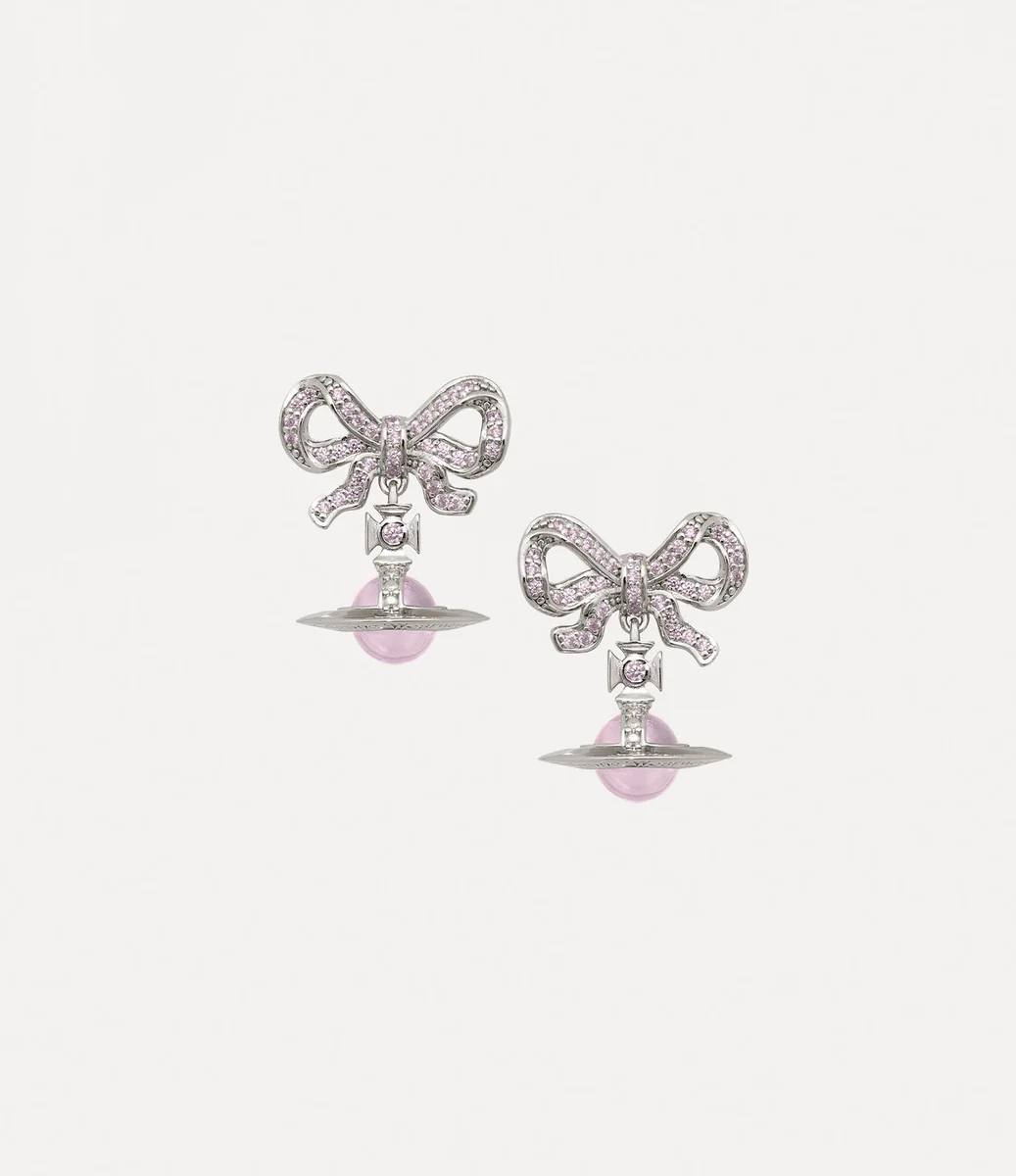 Our Octavie earrings feature a bow-stud design inspired by Georgian jewellery, adorned with pavé-set glistening crystals in pink hues. The piece incorporates the house’s signature three-dimensional dangling orb motif, finished in platinum-tone silver and centred with a delicate pink crystal ball.