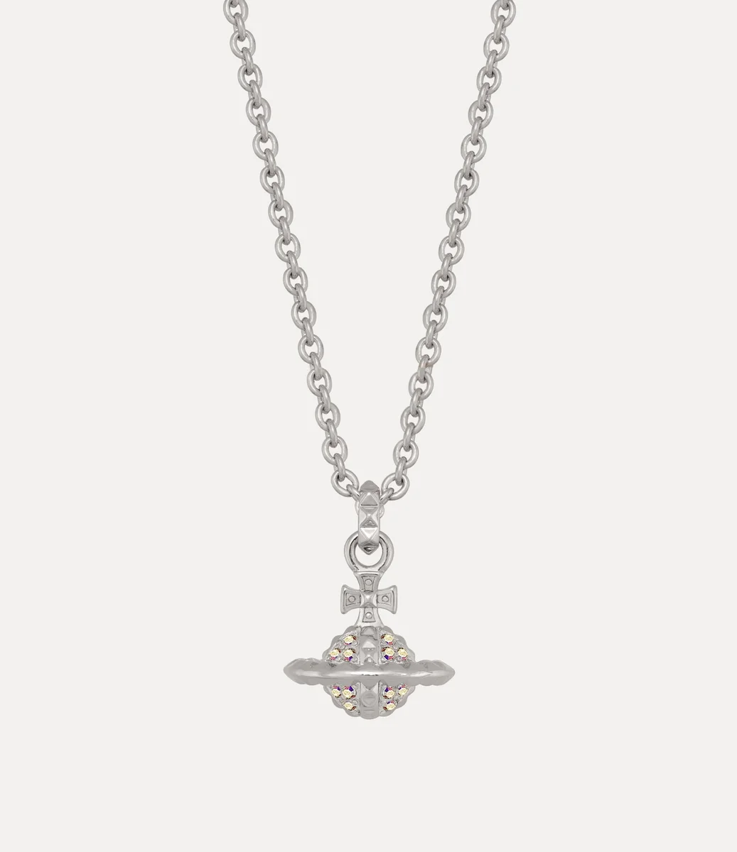 The design of our Small Mayfair Orb Pendant necklace draws inspiration from our signature orb emblem – synonymous with Vivienne’s vision of launching tradition into the future. The piece features a three-dimensional orb pendant in the centre of the design, embellished with iridescent gemstones and highlighted by stud details, evoking the house’s signature punk approach.