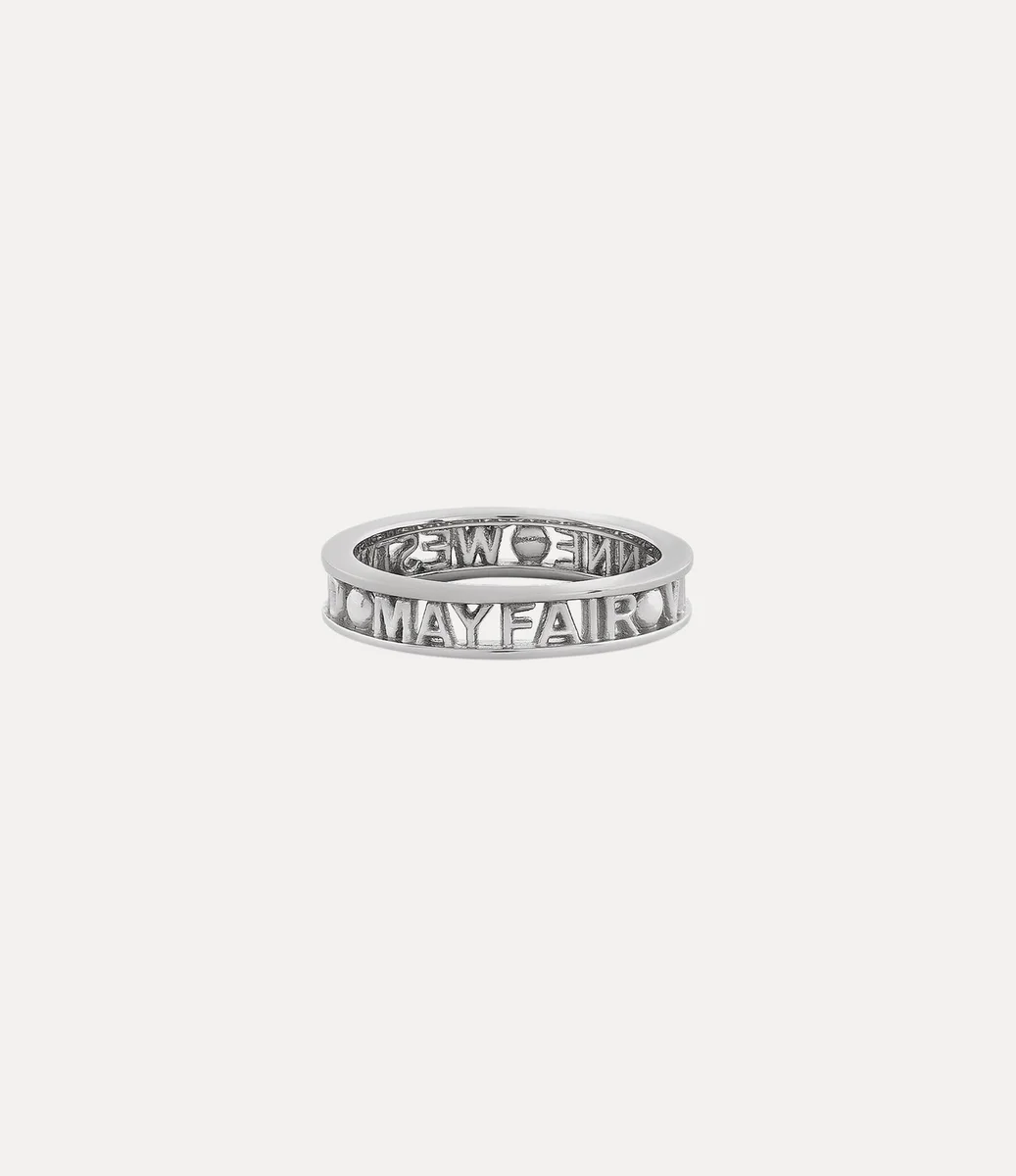 The Vivienne Westwood Westminster ring is named after the esteemed Westminster district in London, renowned for its rich history and cultural importance. The piece receives a silhouette crafted from recycled silver, adorned with a platinum-tone finish that elegantly encircles the slim lettering logo on the band.
