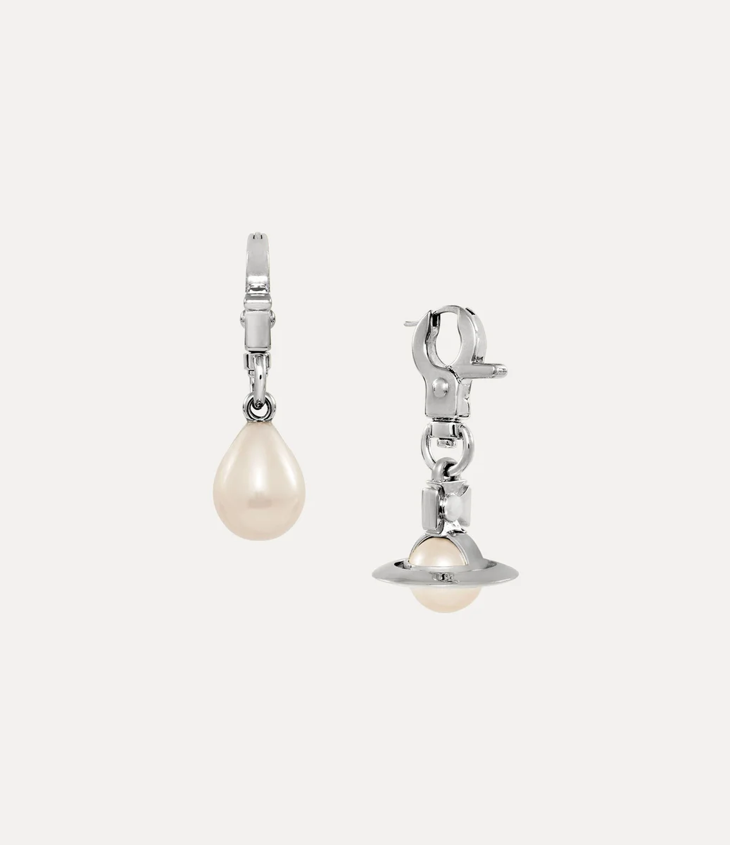 Our Claude earrings feature an asymmetric design, elevated by silver-tone plating. Adorned with an all-metal dangle orb – symbolising Vivienne’s vision of merging tradition with the future – these earrings are further enhanced by a classic pearl drop, suspended from a distinctive swivel hardware-inspired clasp.