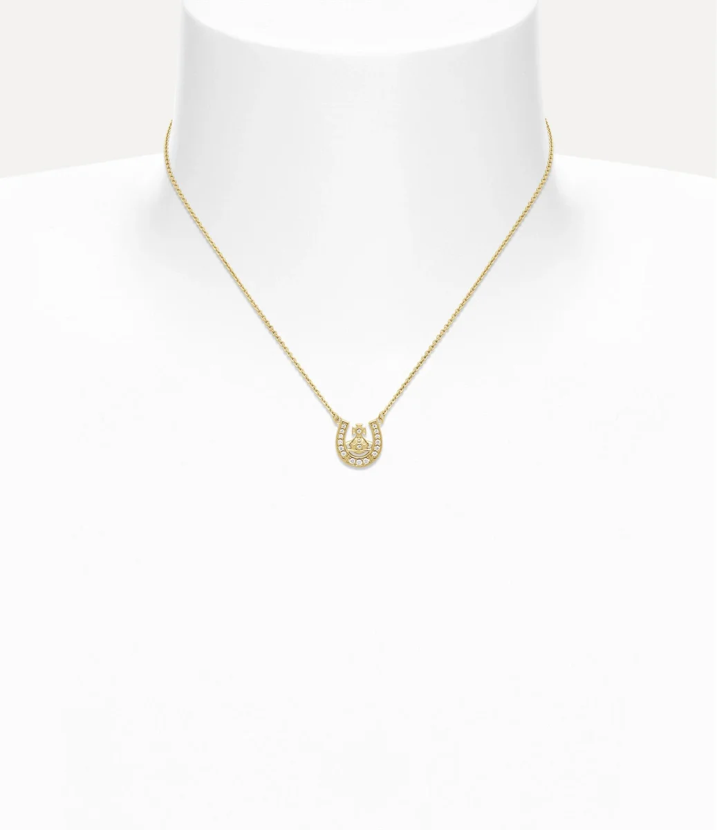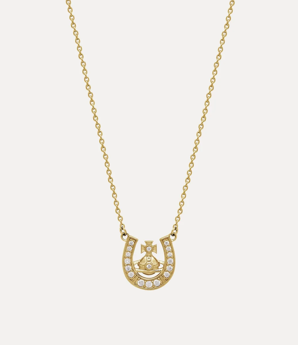 Our Mare Pendant necklace is crafted from recycled silver, complete with polished gold-tone plating. The design features the house’s classic orb and horseshoe motif, honouring signature iconography of the house, adorned with tonal crystal details.