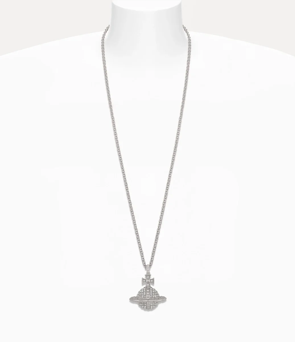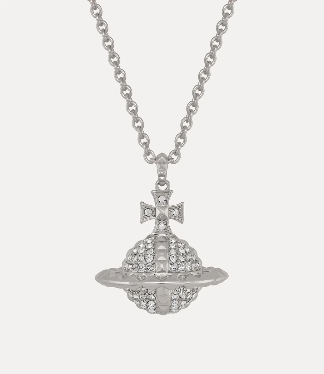 Our Mayfair Large Orb pendant necklace has been refreshed with silver-tone plating and encrusted with white gemstones. Pyramid-stud accents run throughout the design, symbolising non-conformity and honoring the house’s iconic punk aesthetic. This statement piece features our signature orb motif, embodying Vivienne’s vision of redefining tradition for the future.