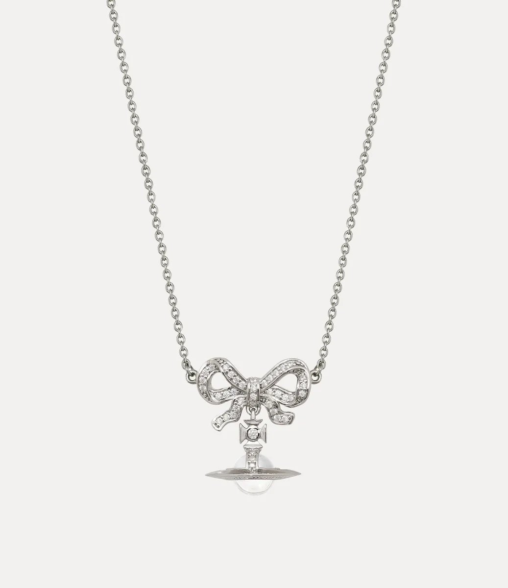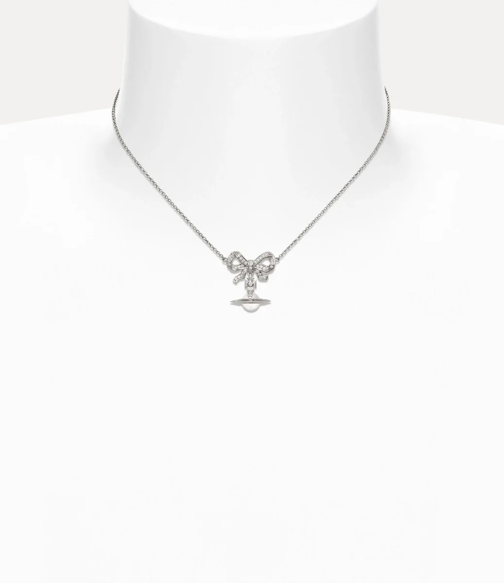 Our Octavie choker receives a bow-shaped design reminiscent of Georgian jewellery, adorned with pavé-set glistening crystals in a white finish. This piece incorporates our signature three-dimensional dangle orb motif, featuring a finely crafted clear gemstone at its centre.
