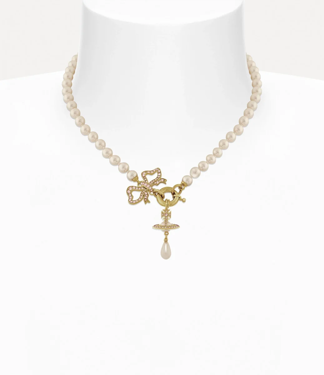 Vivienne Westwood Rigoberta Pearl necklace features a row of Swarovski glass pearls, bow motif and three-dimensional orb motif with a spring-lock fastening.