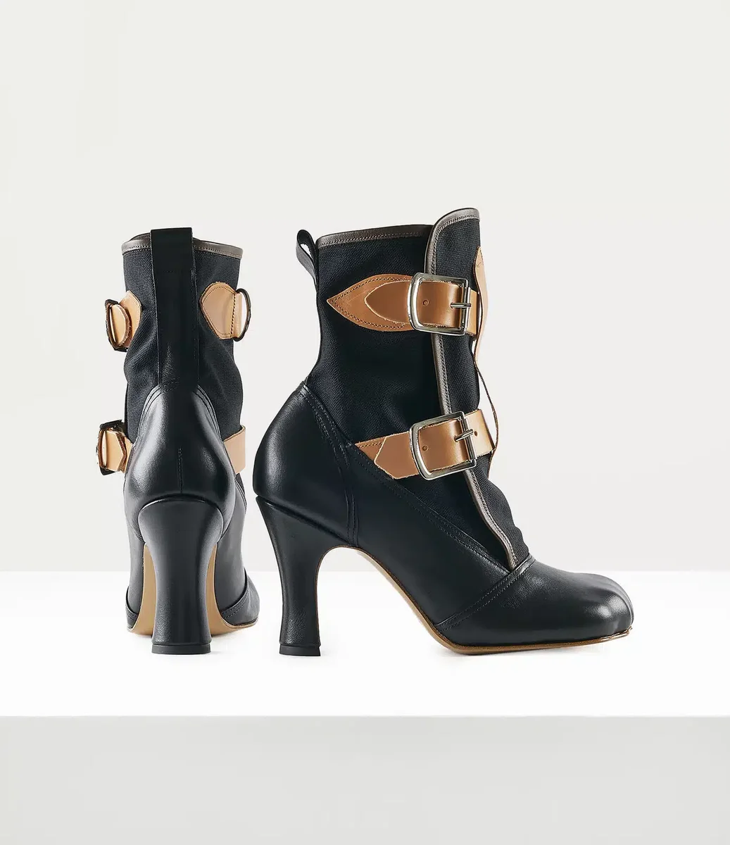 Our Bondage boots, first seen in the Spring-Summer 2002 ‘Nymphs’ collection, feature a Seditionary upper inspired by the archival Seditionaries boots. The boots showcase the signature animal-shaped toe, introduced in the Spring-Summer 2000 ‘Summertime’ collection, mimicking an animal’s paw and leaving a unique imprint. Finished with leather roller buckle straps, the design evokes themes of restriction and control from bondage and fetish wear.